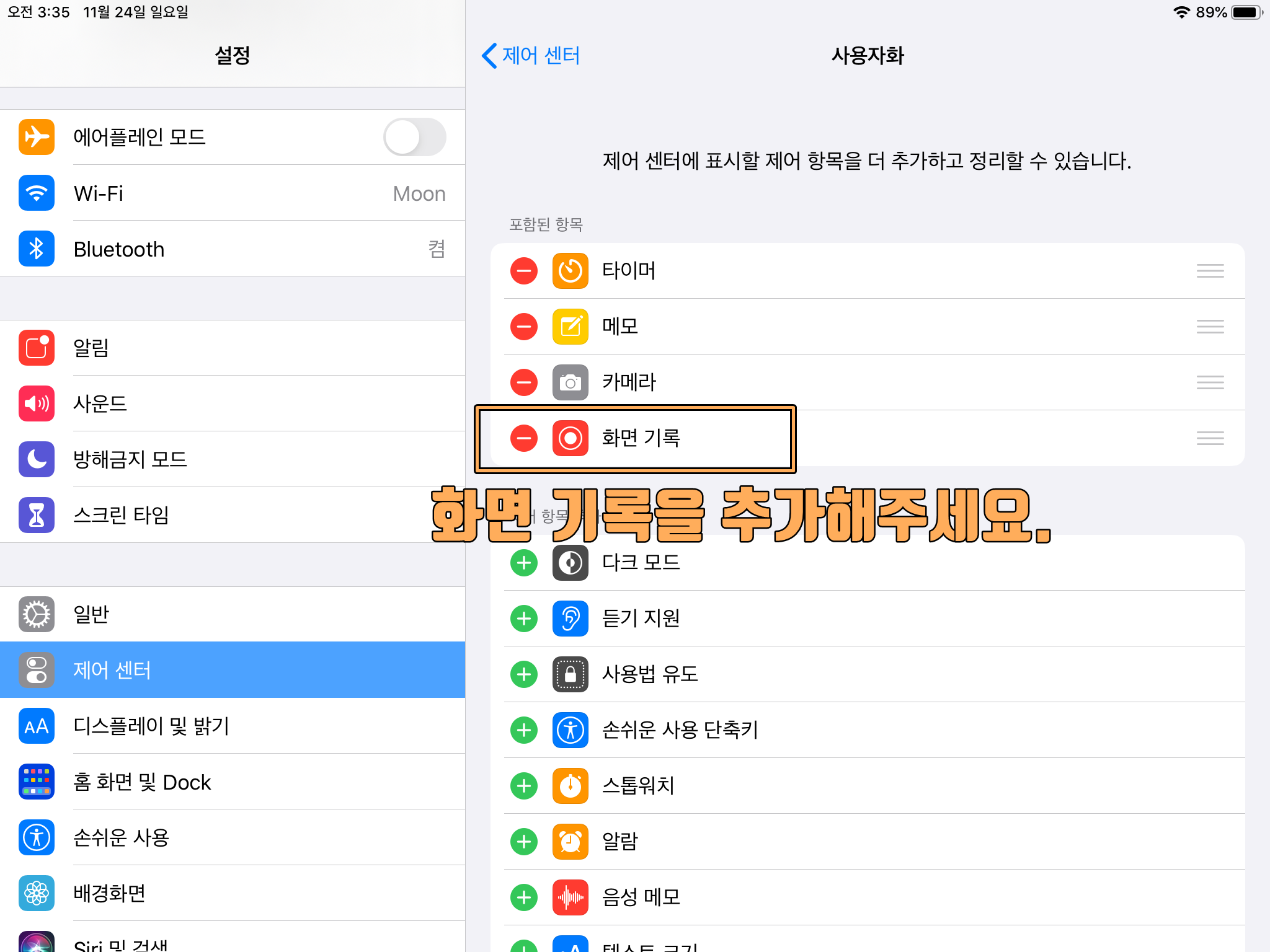 먼저 아이패드에서 화면 녹화 방법을 알아 보겠습니다. 일단 가장 먼저 설정으로 들어가 제어 센터에 가줍니다. 그곳에서 화면 기록을 추가해 줘야 화면 녹화를 할 수 있습니다. 제어센터에 등록을 하면 화면을 위에서 아래로 쓸어 내렸을 때 기능이 추가 되어 있습니다.
