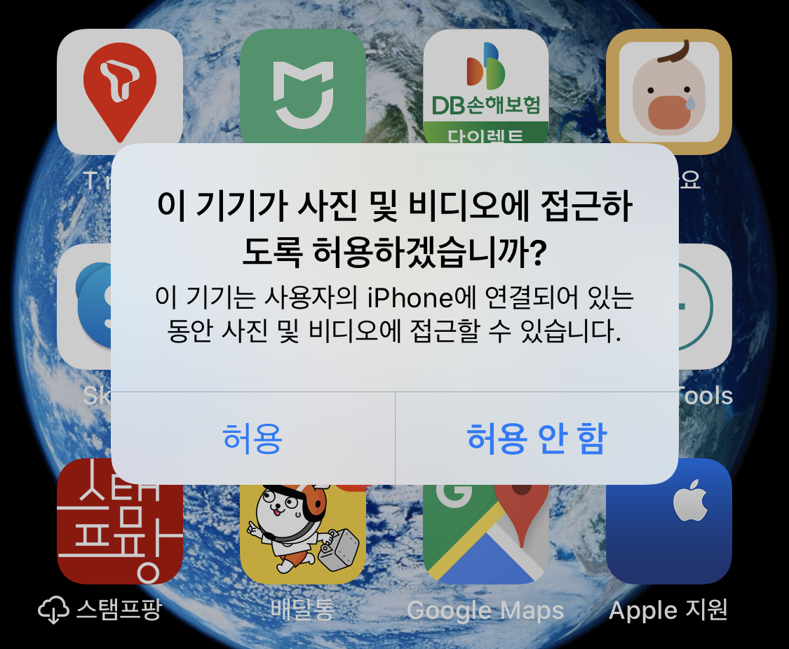 컴퓨터와 연결을 하기 위해서는 케이블이 필요합니다. 아이폰11까지도 아직은 라이트닝 케이블을 사용합니다. 그래서 라이트닝 케이블이 필요한데, 애플의 정품이 아닌경우 케이블이 인식이 안되는 경우가 발생할 수 있으니 가능하면 애플의 정품을 사용하는 것을 추천합니다. 아이튠즈로 옮기는 방법도 있지만, 아이튠즈가 없는 경우에도 가능합니다. 컴퓨터와 아이폰을 연결하면 왼쪽과 같은 메세지가 나오며 허용을 눌러 주면 됩니다. 아이튠즈가 있는 컴퓨터의 경우 오른쪽과 같은 그림이 나오면 신뢰를 눌러 주면 됩니다.
