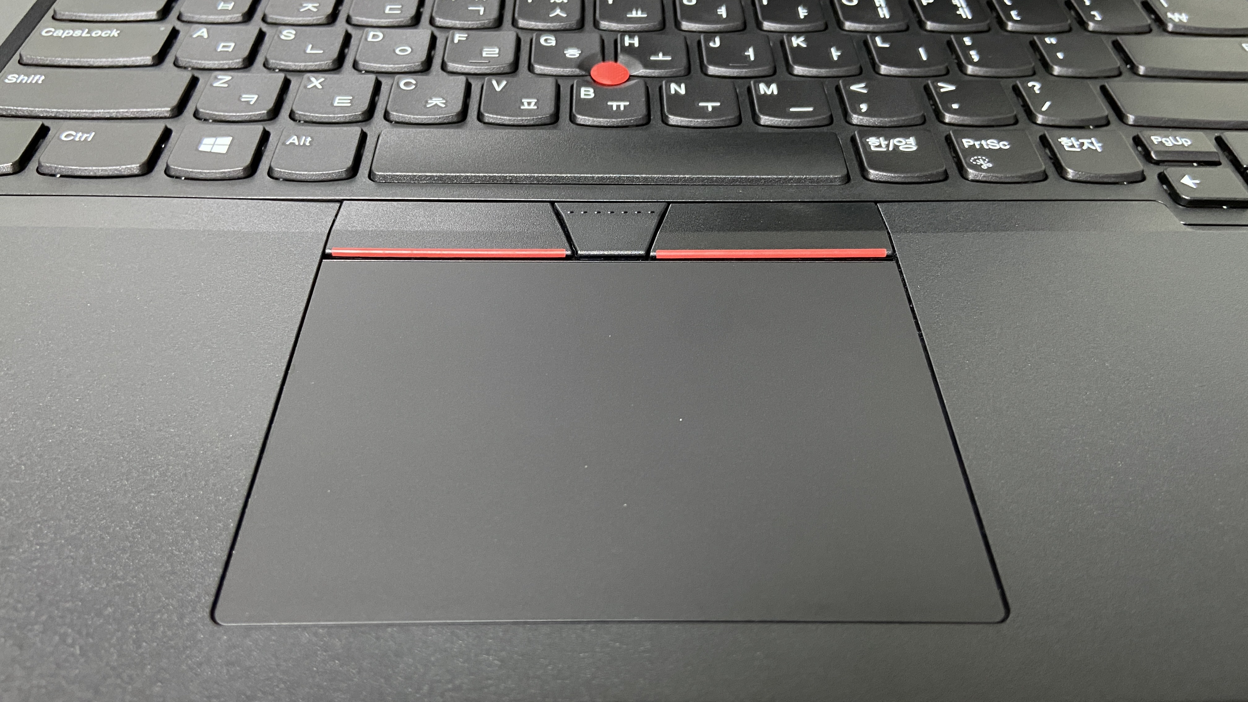 씽크패드 노트북의 키보드입니다. 겉으로 보기에는 투박해 보이는데, 타이핑 느낌은 아주좋습니다. 터치패드 상단에 마우스 버튼이 있는 부분이 특이합니다. 그리고 씽크패드의 상징인 트팩포인트 일명 빨콩이 있습니다. 버튼식으로 눌리는 줄 알았는데 터치 방식인거 같습니다. 아직은 익숙하지 않아 크게 활용성을 하진 못하고 있습니다. 대신 트랙패드 위의 버튼이 의외로 활용성이 좋습니다. 마우스 없이 노트북을 사용해도 크게 불편하지 않습니다. 그리고 터치패드를 터치하면 왼클릭이 되는 부분도 가능합니다. 저는 이미지만 보고 터치패드 터치 클릭이 안될줄 알았습니다.
