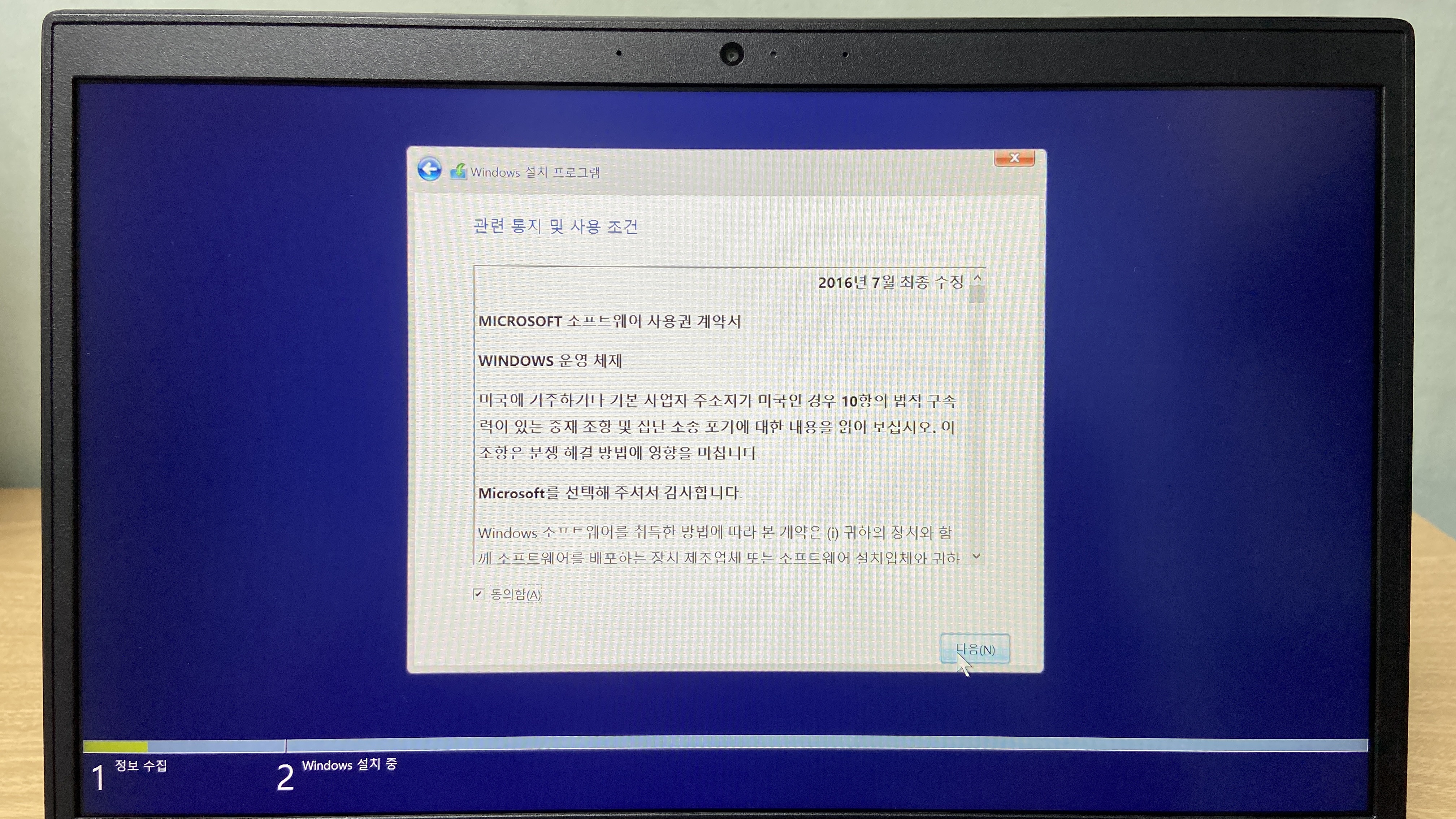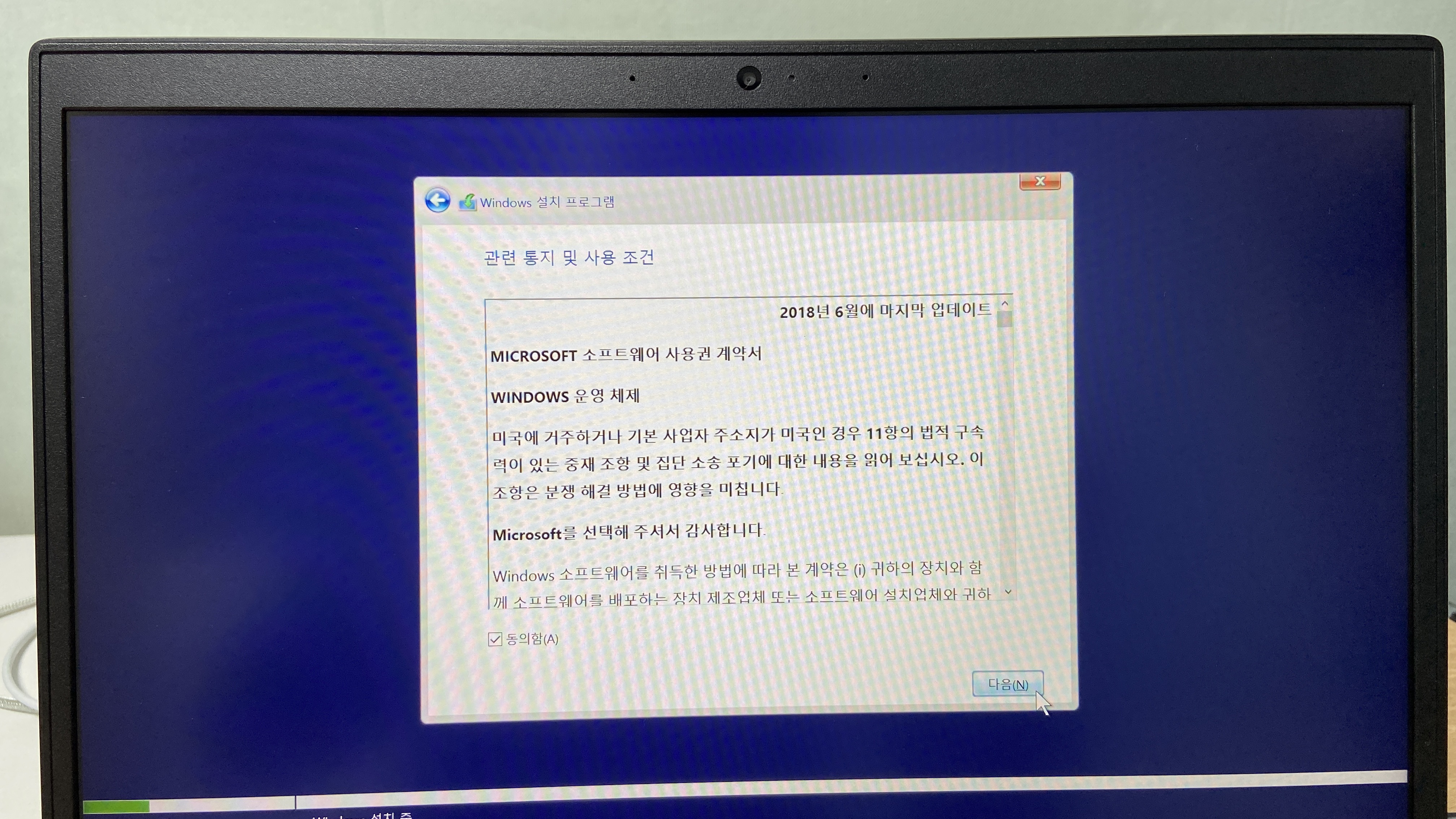 하지만 계속해서 설치 에러가 나왔습니다. 정품 윈도우에 들어간 설치 파일이 계속 에러가 나니 조금은 어이가 없었습니다. usb가 고장이 난건지 버전이 너무 낮아서 안되는건지 몰라 결국 새롭게 윈도우10 부팅 usb를 만들어 설치 했습니다. 제가 구매한 제품은 약관 동의가 2016년인데, 새롭게 만든건 2018년도 입니다. 너무 오래되서 설치가 안된게 아닌가 싶습니다. 윈도우 설치가 안되고 시간이 너무 오래 걸려 나중에는 윈도우가 설치된 제품을 구매해야 하나 살짝 고민이 됬습니다.
