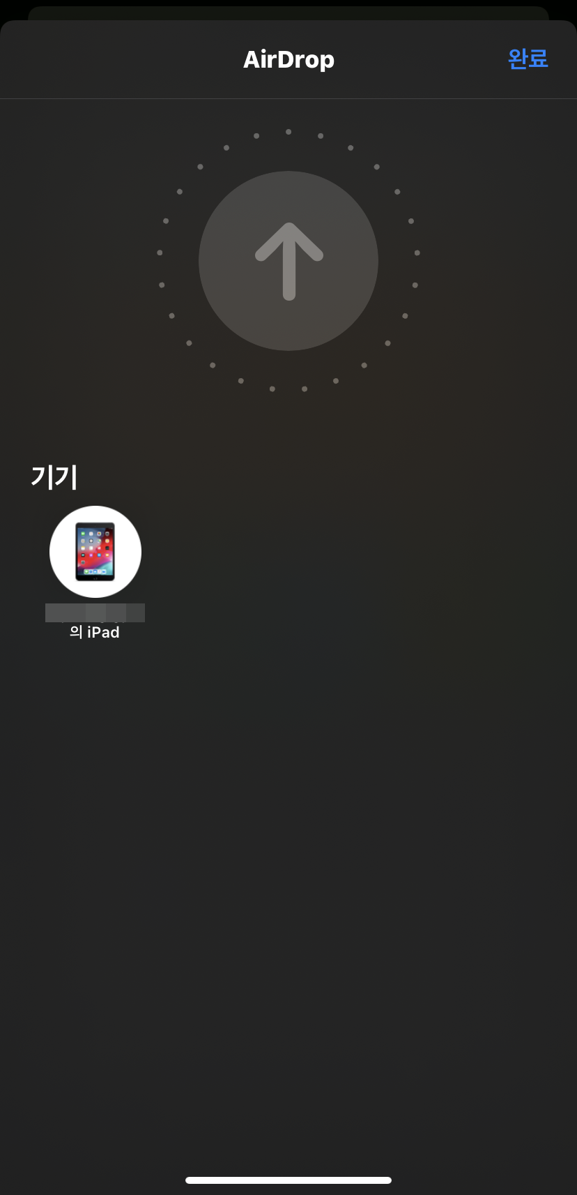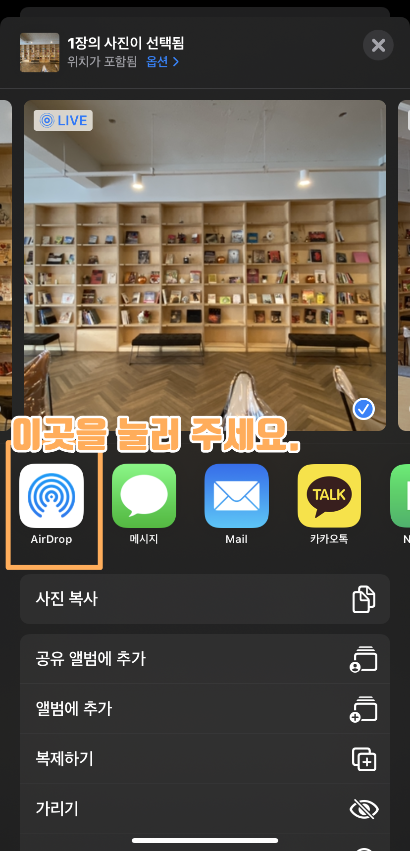 에어드롭을 이용해 아이폰에서 아이패드로 사진을 보내보겠습니다. 원하는 사진을 선택하고 화면 하단 왼쪽을 눌러 주세요. 그러면 AirDrop / 메서지 / 메일 / 카카오톡 등이 나오는데, AirDrop을 선택해주세요. 그러면 주변 기기를 검색해 전송이 가능합니다.