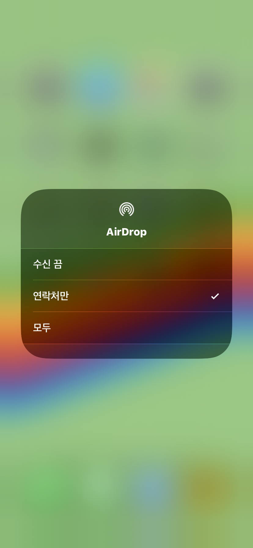 화면 상단을 쓸어 내리면 위와 같은 메뉴가 나오는데 이곳에서도 에어드랍 설정이 가능합니다. 화면 우측 상단의 네트워크 부분을 길게 눌러주면 AirDrop메뉴가 나오고 이곳에서도 설정을 변경할 수 있습니다.