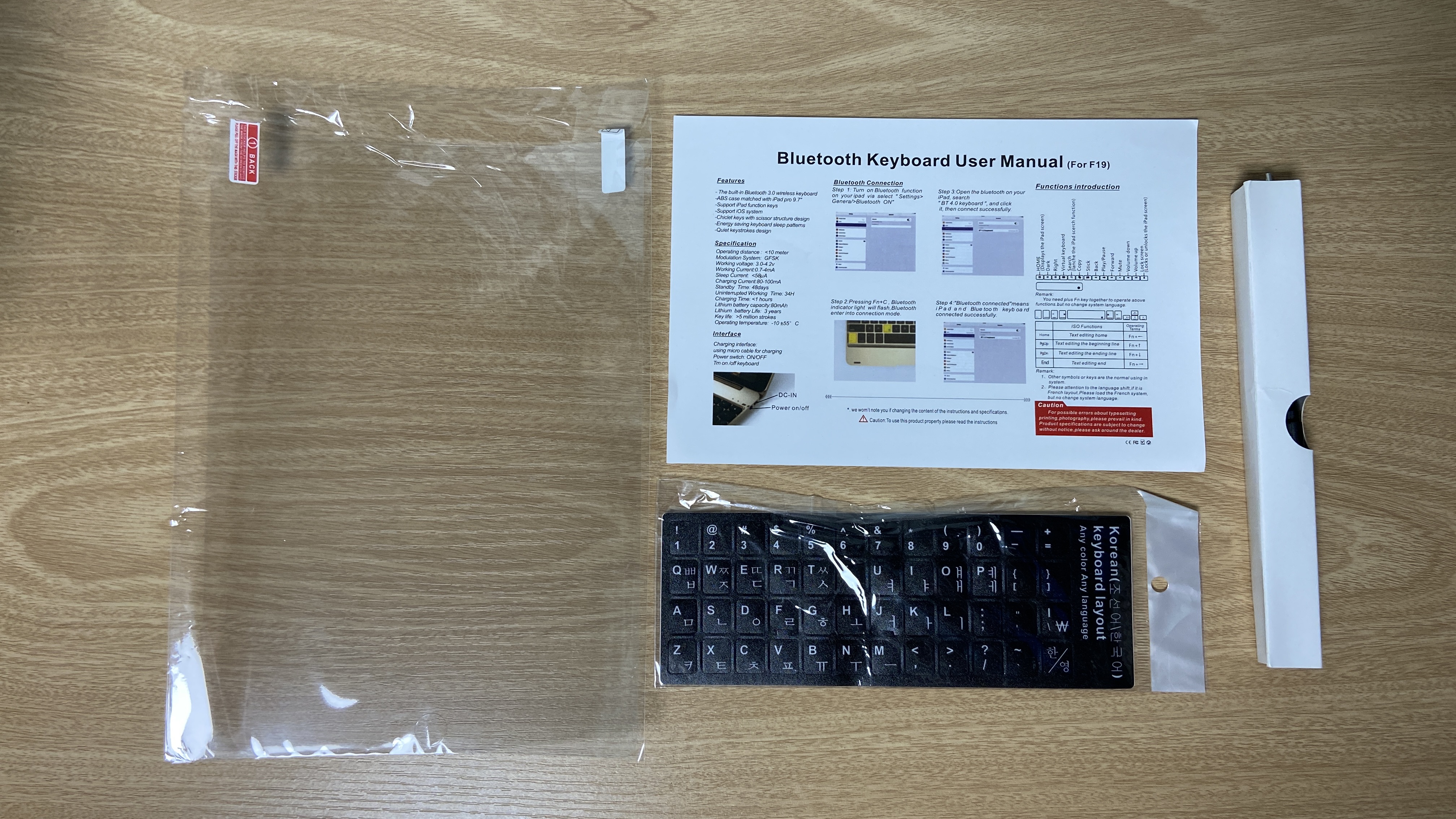 $16으로 저렴한 가격인데, 제품 구성이 아주 좋습니다. 키보드 케이스 / 액정 보호필름 / 한글 스티커 / 충전 케이블 / 터치펜 / 설명서가 들어있습니다. 아이패드 액정 보호필름과 터치펜이 들어 있는건 의외였습니다. 구성품이 정말 화려하네요.