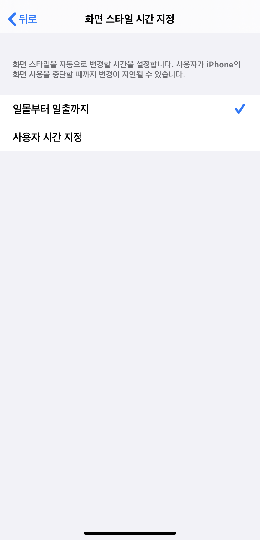 설정에서 디스플레이 및 발기에 들어가 주세요. 그것에 들어가면 라이트 모드 / 다크모드를 선택할 수 있습니다. 항상 다크모드를 사용하고 싶은 분은 다크모드를 선택해 주면 됩니다. 아니면 일몰부터 일출까지 사용을 하거나 사용자가 시간을 지정해 아이폰의 다크모드를 사용할 수 있습니다.