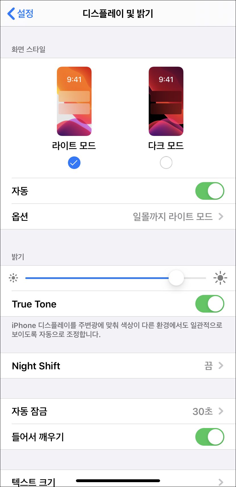 나이트 시프트(Night Shift)는 어두운 곳에서 화면의 색상을 자동으로 따뜻한 색으로 변경을 해줍니다. 자기전에 스마트폰을 자주 보는 분들이 설정하면 괜찮은 기능입니다. 다만 화면이 누렇게 되어 저는 개인적으로 좋아 하진 않는 기능입니다.