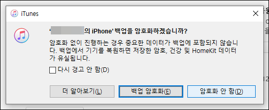 백업을 할 때 암호화를 할 수 있습니다. 저는 혼자 사용하는 노트북으로 암호화가 필요 없어 암호화를 진행하진 않았습니다.