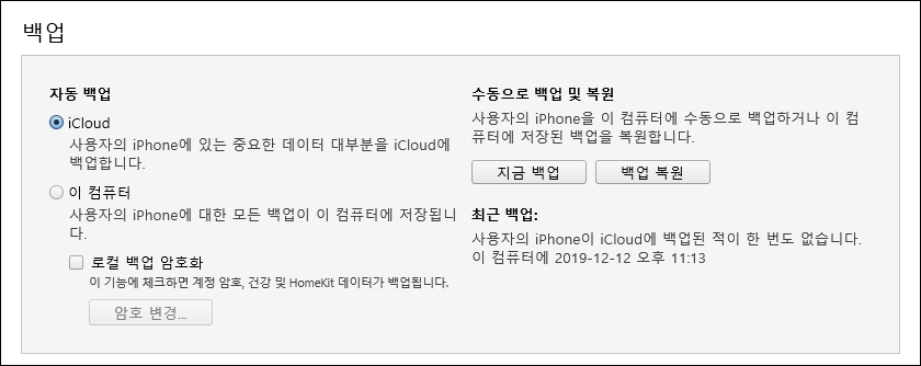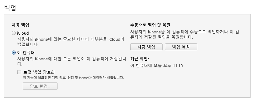 백업 방법을 아이클라우드나 이 컴퓨터 중에 선택할 수 있습니다. 아이클라우드가 아닌 컴퓨터에 백업을 해야 하니 이 컴퓨터를 선택해 주세요. 그리고 지금 백업을 눌러 주면 아이클라우드를 이용한 백업이 가능합니다. 이곳에서 백업한 자료를 복원도 할 수 있습니다.