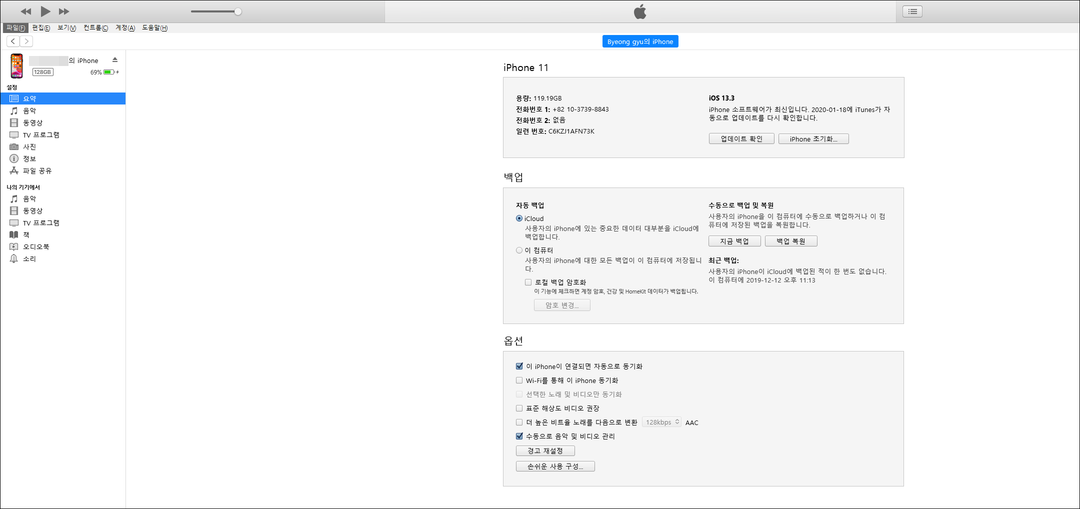 그러면 아이폰에 관한 다양한 메뉴가 나옵니다. 백업을 하기 위해서 요약 메뉴로 들어가야 합니다. 그곳에서 내 아이폰의 업데이트 정보 등을 확인과 옵션 선택이 가능합니다.