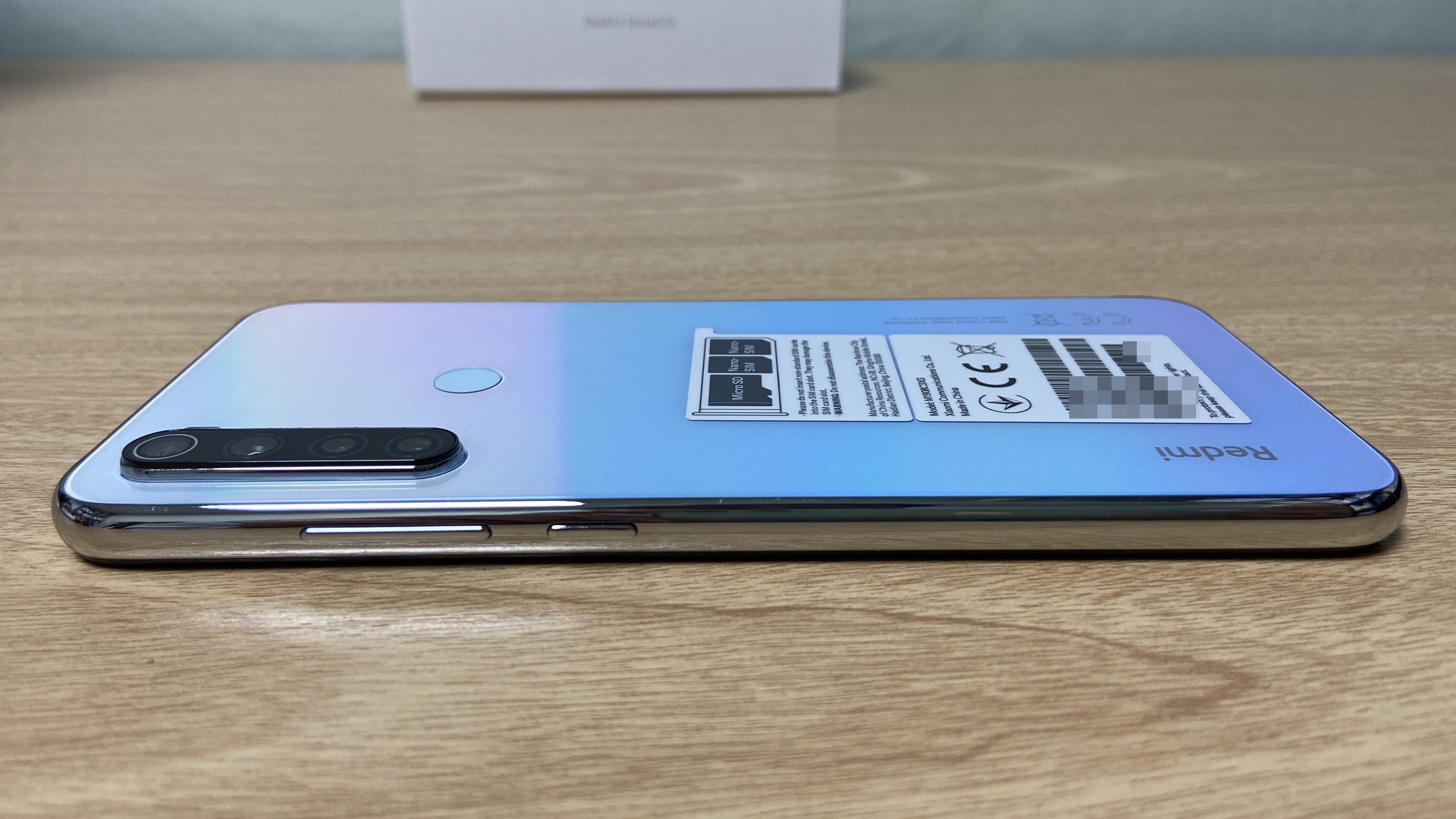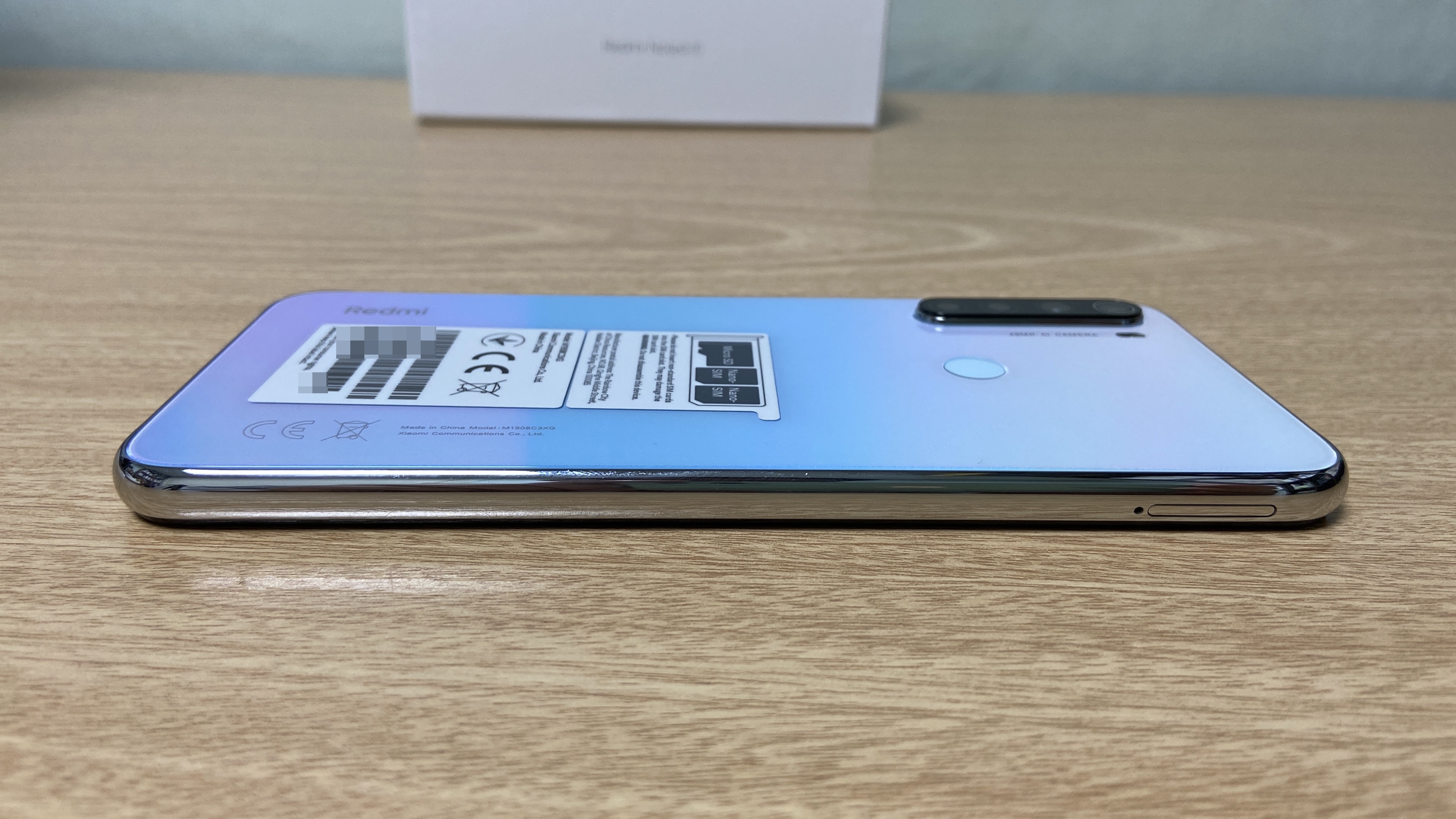 전면에는 레드미 노트8T의 특징이 간력하게 적혀 있습니다. 전면 카메라 말고는 모두 화면입니다. 다만 하단 베젤이 조금 큰 편이며, Redmi라고 각인이 되어 있습니다. 후면에는 카메라, 지문인식이 있습니다. 그리고 스티커에 유심에 대한 설명이 있는데, 듀얼심과 SD카드를 넣을 수 있습니다.