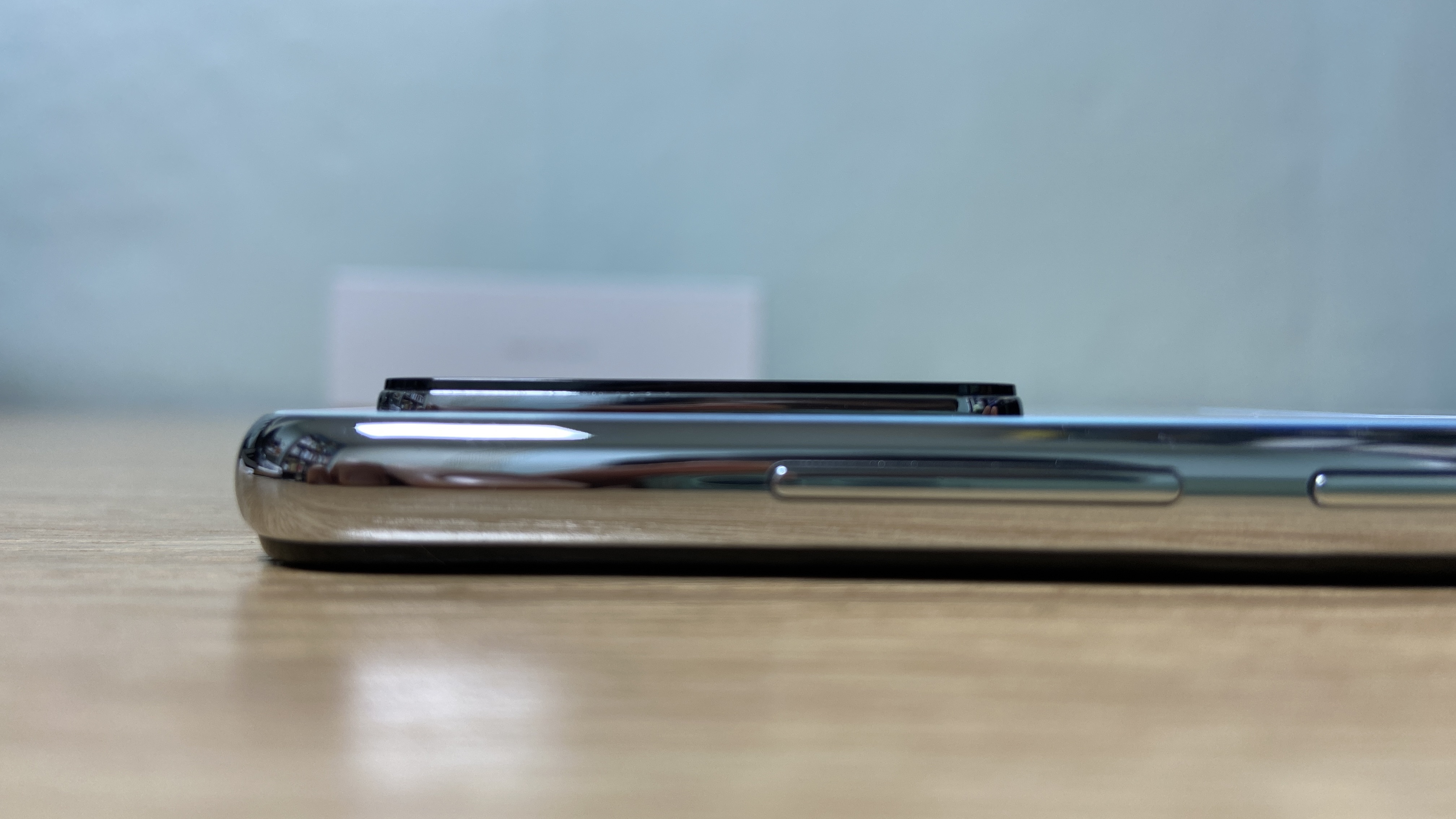 오른쪽 측면에는 볼륨 버튼과 전원 버튼이 있고, 왼쪽 측면에는 버튼이 없습니다. 대신 유심 트레이가 위치해 있습니다.