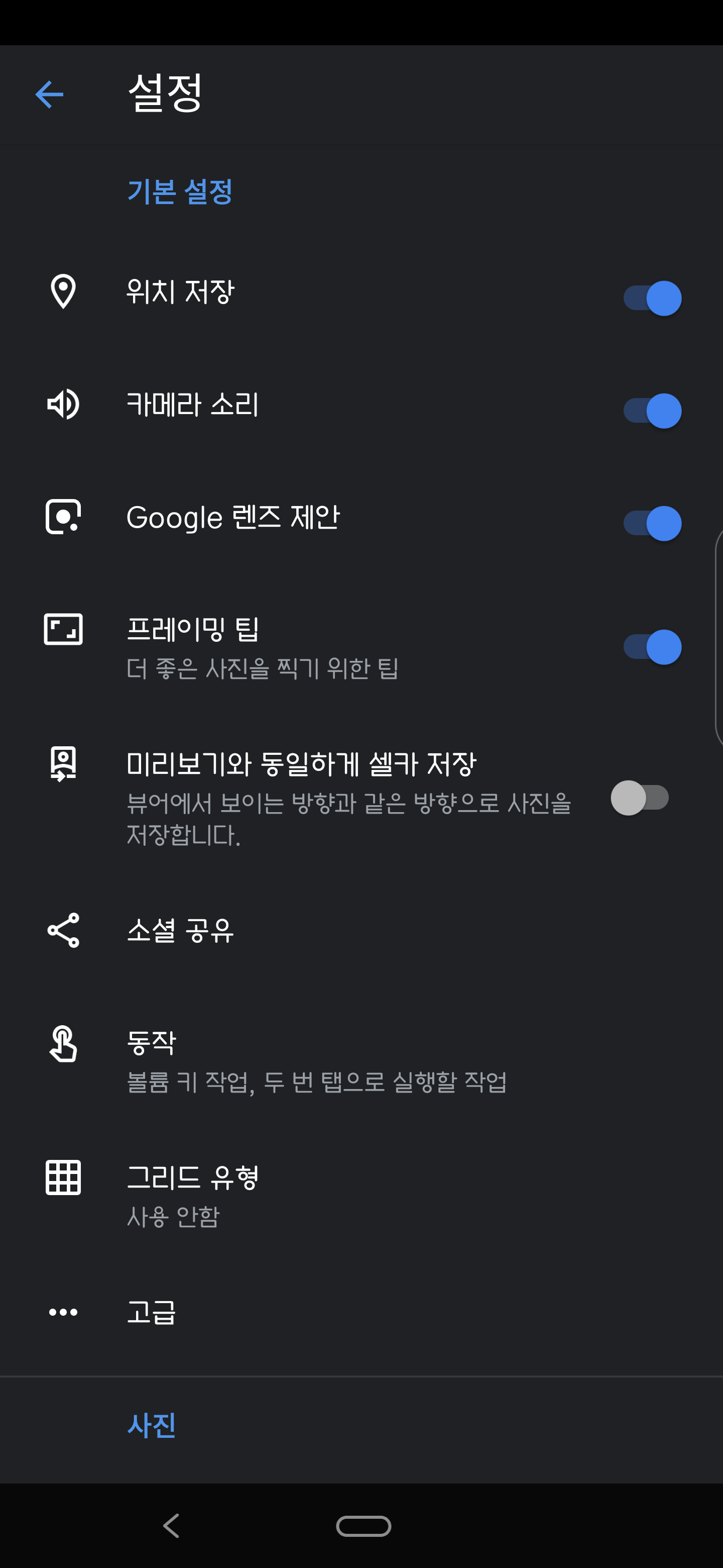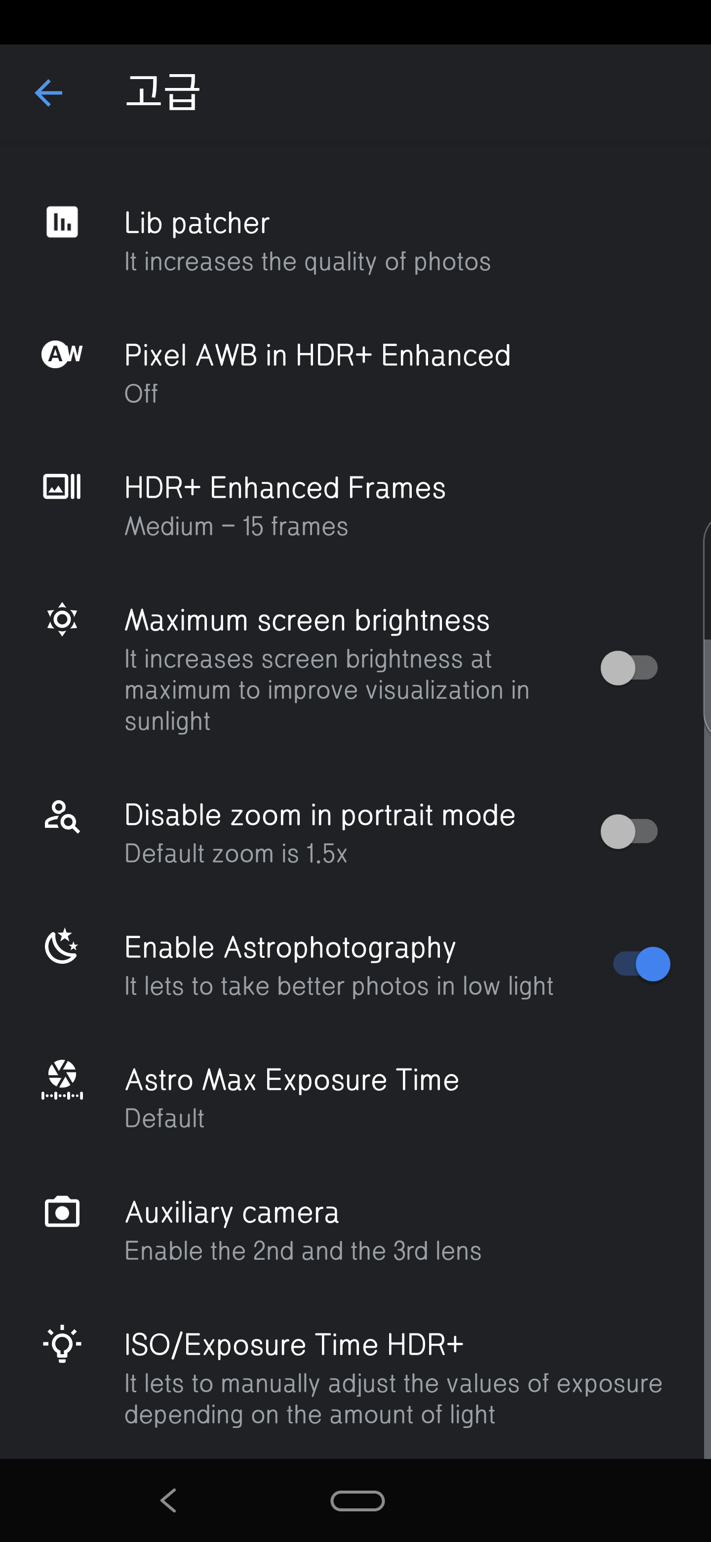 가장 먼저 설정을 변경해 줘야 합니다. 설정에 들어가면 고급 메뉴가 있습니다. 이곳에 들어가 스크롤을 내리면 중간에 Enable Astrophotography(천체사진)라는 메뉴가 있는 활성화 시켜줘야 합니다. 이메뉴를 활성화 시켜 놓으면 야간모드에서 모두 천세사진 모드로 촬영이 되기 때문에 일반 야간모드 사진을 촬영할 때는 꺼놓으셔야 합니다.