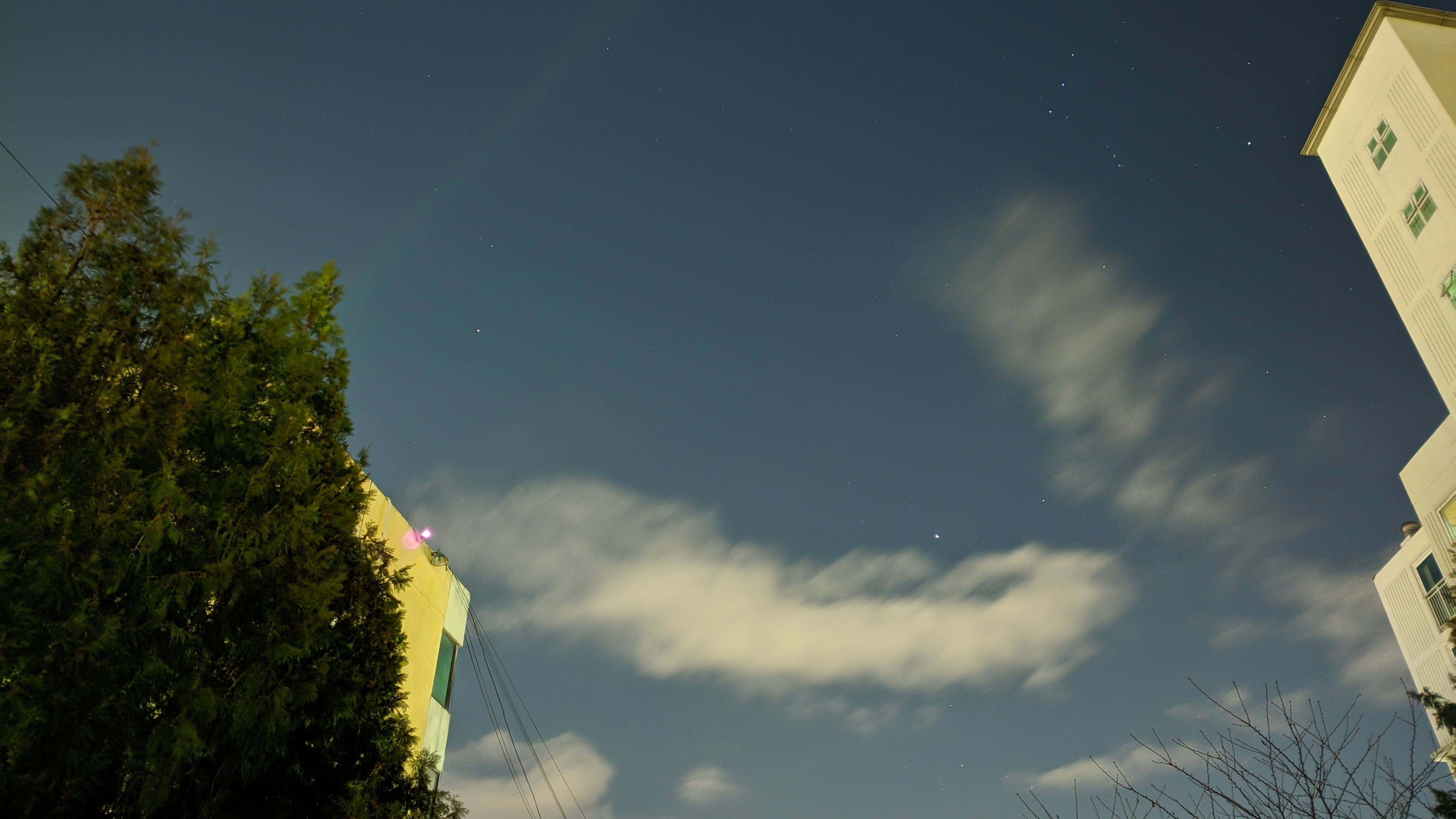 왼쪽이 일반 야간모드 / 오른쪽이 천체모드이며 삼각대 없이 촬영을해서 사진이 살짝 흔들렸습니다. 양쪽사진이 확연하게 차이가 납니다. 앞에 나온 나무는 큰 차이가 없는데, 하늘 사진은 정말 다릅니다. 디테일과 색감이 정말 살아 나네요.