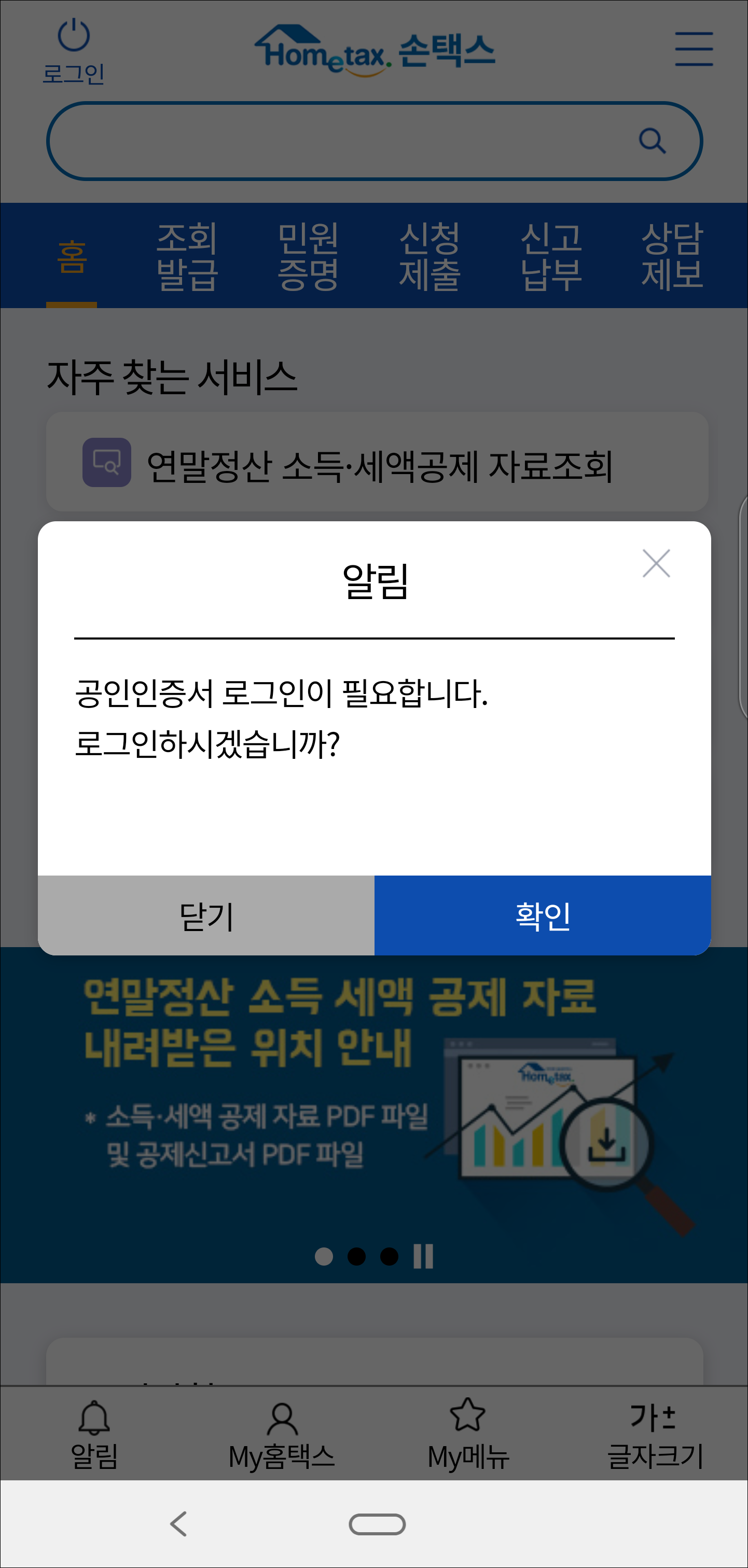 일단은 오늘의 목적인 연말정산 간소화 서비스를 이용해 보겠습니다. 어플을 실행하고 메인 화면에 있는 연말정산 소득, 세액공제 자료 조회를 눌러 주세요. 그런데 해당 자료를 조회하기 위해서는 공인인증서가 필요합니다.