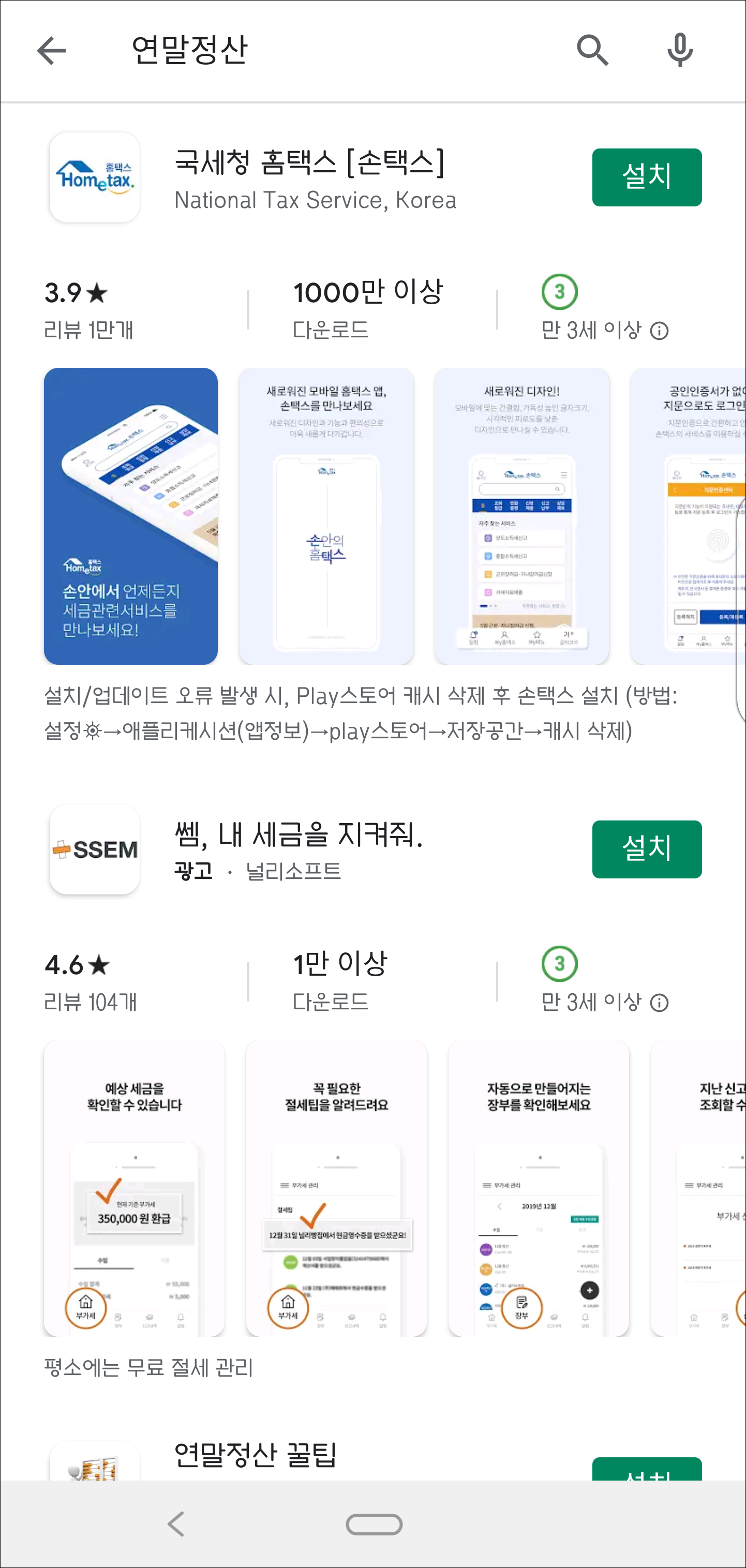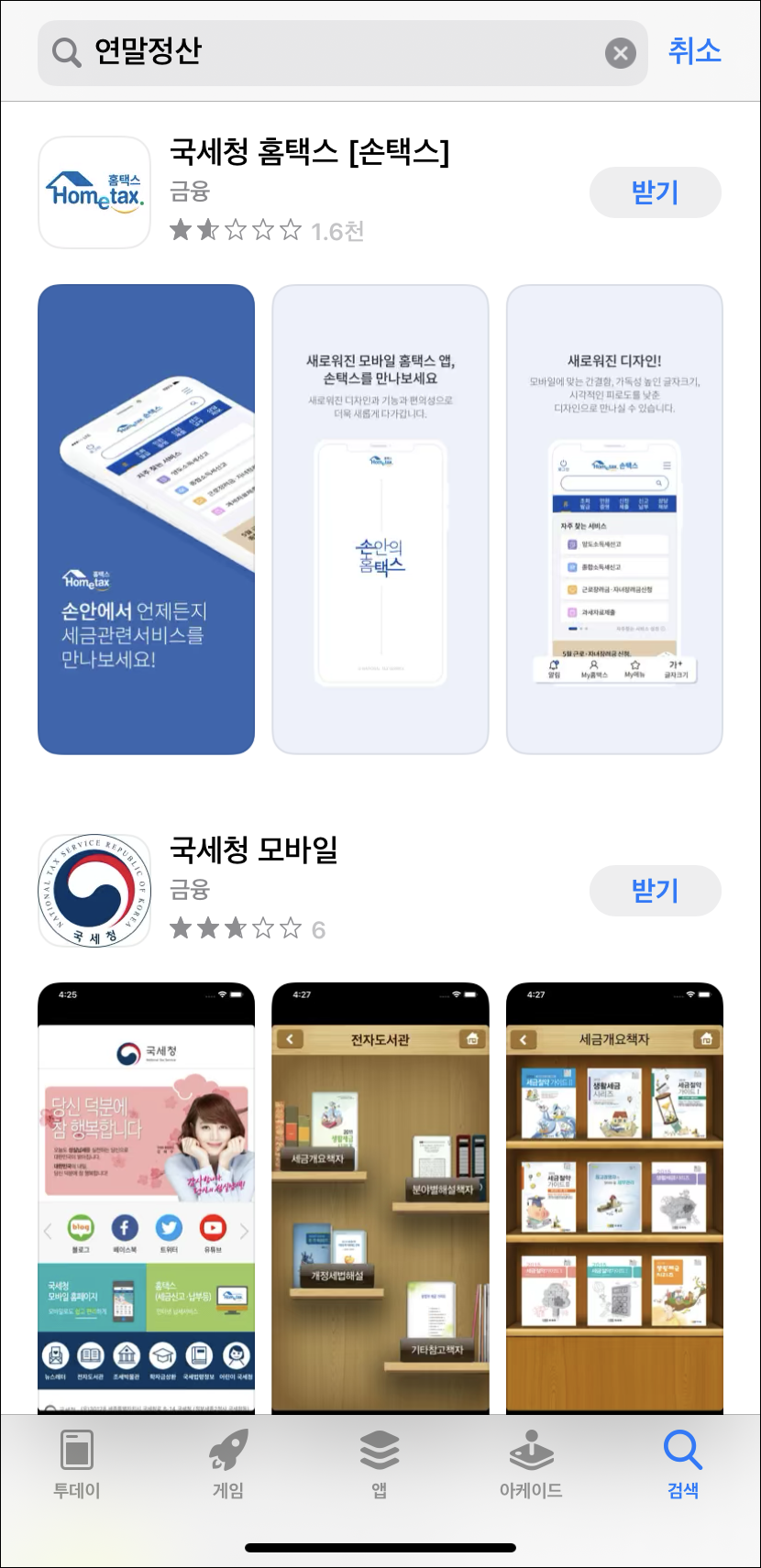 손택스 어플은 앱스토어 및 플레이스토어에 모두 있습니다. 그래서 아이폰과 안드로이드 기종에 상관없이 이용을 할 수 있습니다. 검색은 연말정산만 하면 상단에 나오네요.