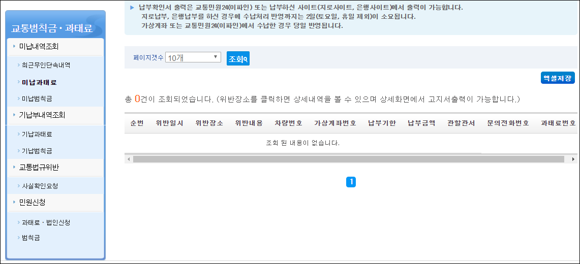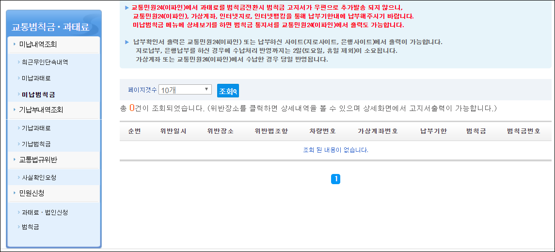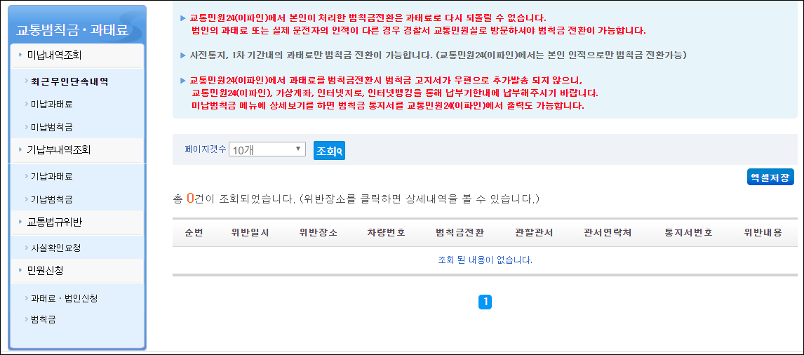 최근 무인단속내역, 미납과태료, 미납벌칙금을 이곳에서 확인할 수 있습니다. 다행이 최근 무인단속된 내역이 없습니다.