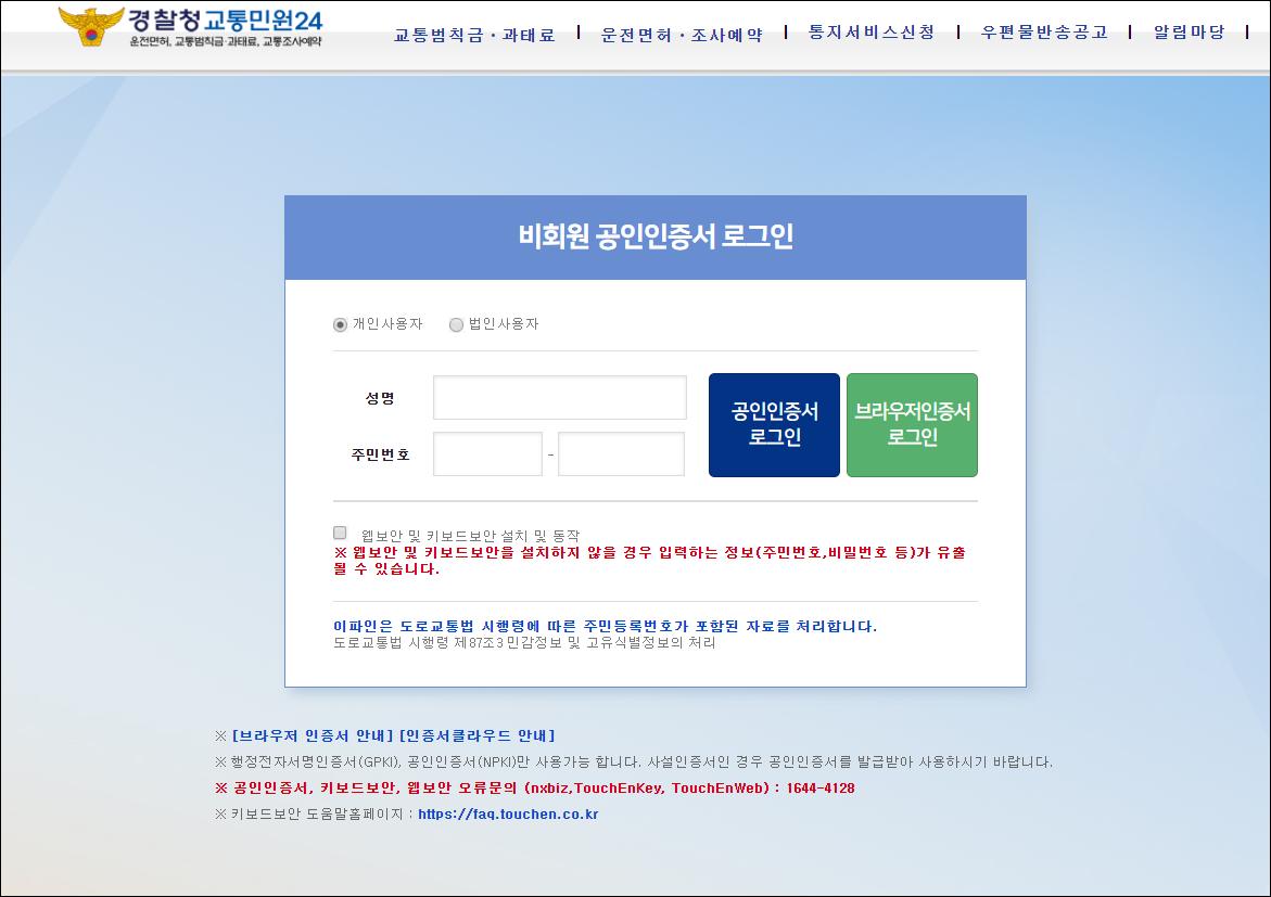 이파인 교통 민원 24시 사이트에 접속을 해주세요. 서비스를 이용하기 위해서는 로그인을 해야 합니다. 공인인증서 또는 디지털원패스를 통해 로그인을 할 수 있습니다. 개인적으로 디지털패스원을 통해 로그인을 하는게 편리합니다. 회원가입 방법에 대해 포스팅을 했습니다. 공인인증서는 컴퓨터를 옮겨가며 사용이 아려운데, 디지털 패스원은 가입을 해 놓으면 언제 어디서나 사용이 가능해 편리합니다.