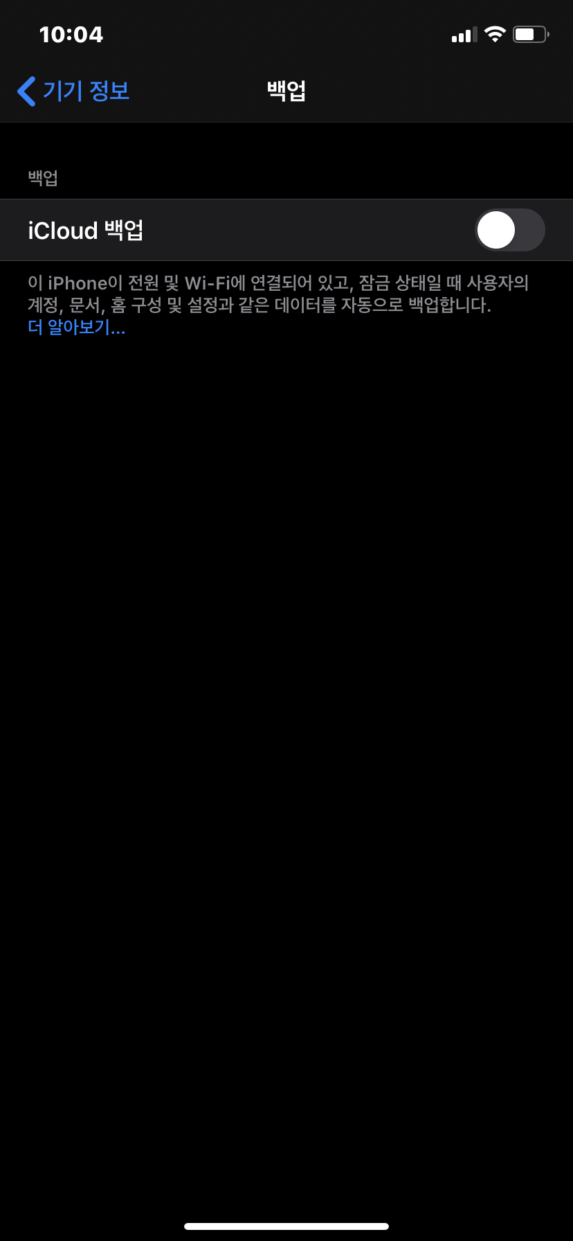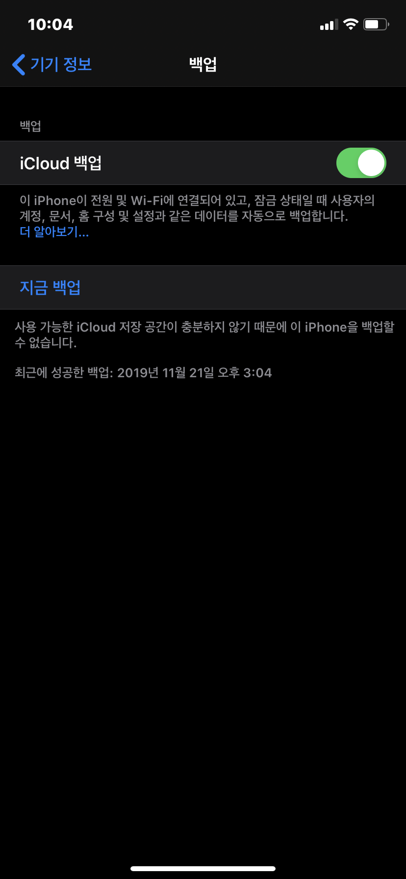 iCloud 백업이 활성화 되어 있는 상태에서 지금백업을 누르면 백업이 가능합니다. 하지만 현재 아이클라우드에 용량이 부족해 백업을 할 수 없습니다. 아이클라우드 백업을 사용하기 위해서는 별도로 용량을 구매해야 합니다. 그래서 저는 아이튠즈로 백업을 하는데, iCloud 백업 메세지가 수시로 와서 귀찮습니다. 그래서 iCloud 백업 메뉴를 비활성화 해놓고 있습니다. 다만 비활성화 할경우는 아이튠드와 동기화 할때 자동으로 백업이 진행됩니다.