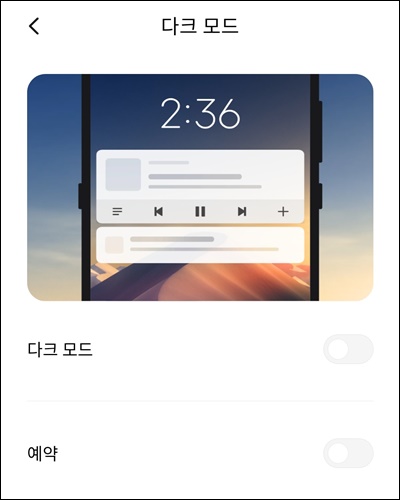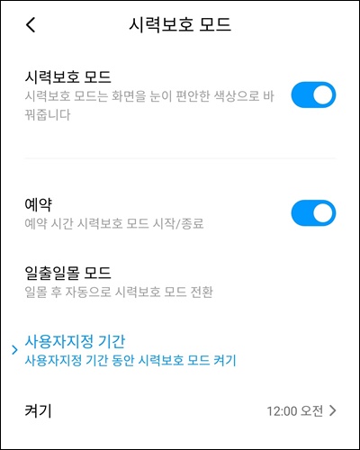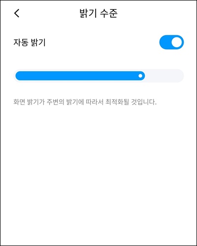 디스플레이 기능을 먼저 살펴보겠습니다. 자동밝기 설정이 가능해 주변 밝기에 따라 디스플레이 밝기가 자동으로 변경됩니다. 그리고 시력보호 모드와 다크모드도 있습니다. 디스플레이가 LCD패널이라 번인 걱정은 없지만, 어두운 곳에서 스마트폰을 사용할 때 다크모드를 활용하면 좋습니다.