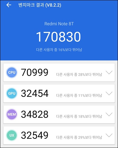 벤치마크를 돌려 보면 17만점 정도 나옵니다. 스냅드래곤 665 프로세서가 들어간 기기와 거의 비슷한 성능이 나옵니다. 스냅드래곤665는 요즘 보급형 스마트폰에 많이 들어가는 칩으로 고사양 게임을 하지 않는 다면 충분히 괜찮은 성능입니다.