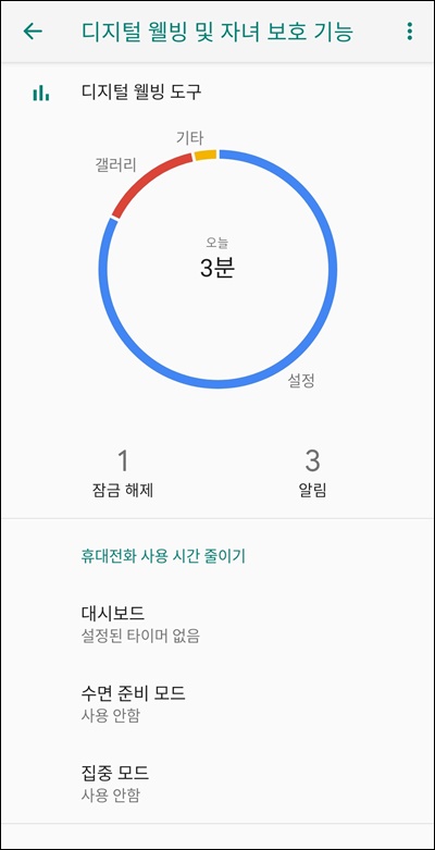 디지털 웰빙 도구 설정도 가능합니다. 수면준비 모드를 통해 휴대전화 방해 없이 숙면을 취할 수 있으며, 집중해야하는 시간에 방해를 받지 않기 위해 집중모드도 설정할 수 있습니다. 편리한 스마트폰이지만 멀리 할 때는 확실하게 멀리 하는 것이 좋습니다.