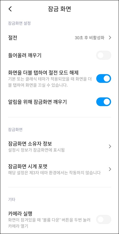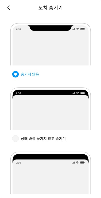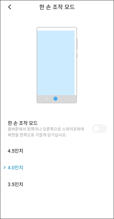 그외에도 노치를 숨기는 기능도 있습니다. 노치를 숨기면서 화면을 활요하거나 노치가 없듯이 스마트폰을 사용할 수 도 있습니다. 그리고 스마트폰을 들어올려 깨우거나 화면을 더블탭하여 절전모드 해제도 가능합니다. 한손모드도 사용이 가능합니다. 6.3인치 화면을 한손으로 컨트롤하기 어려울 경우 화면을 작게 만들어 사용할 수 있습니다. 3.5인치, 4.0인치, 4.5인치 중 선택할 수 있습니다.