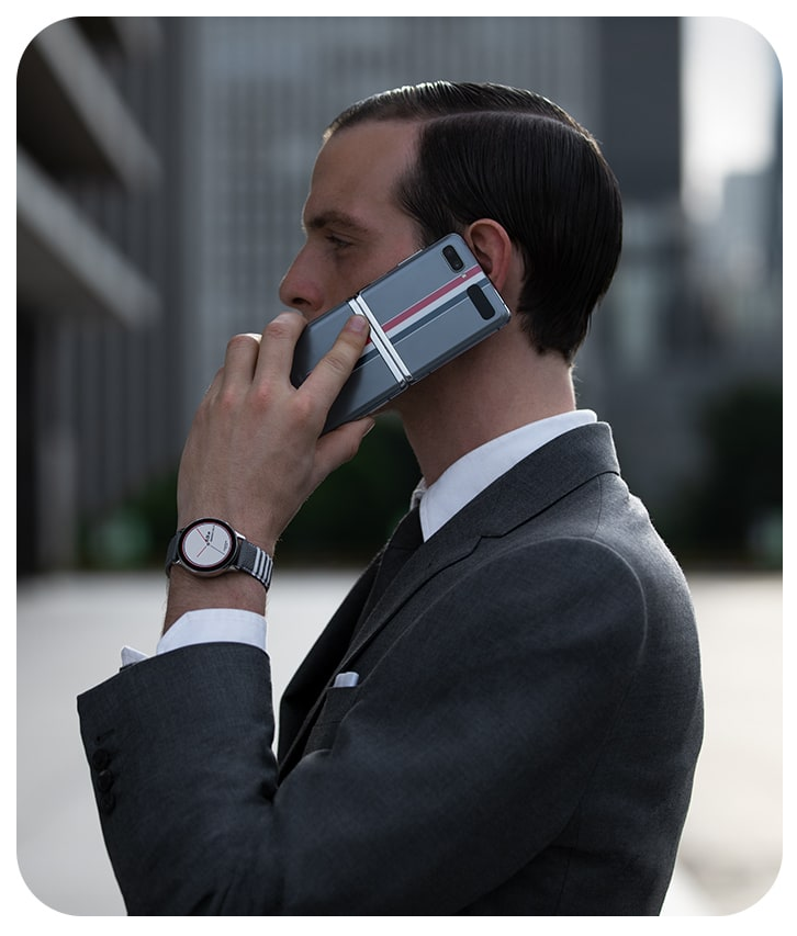 일단 본체를 보면 톰브라운 특유의 디자인을 갤럭시 Z 플립에 입혔습니다. 기본 모델은 밋밋해 보이는데, 무늬가 하나 들어가니 완전히 달라 보입니다. 톰브라운 에디션은 스마트폰은 물론 스마트워치 갤럭시 워치 액트비2와 블루투스 이어폰 갤럭시 버즈 플러스가 같이 들어가는 구성입니다.
