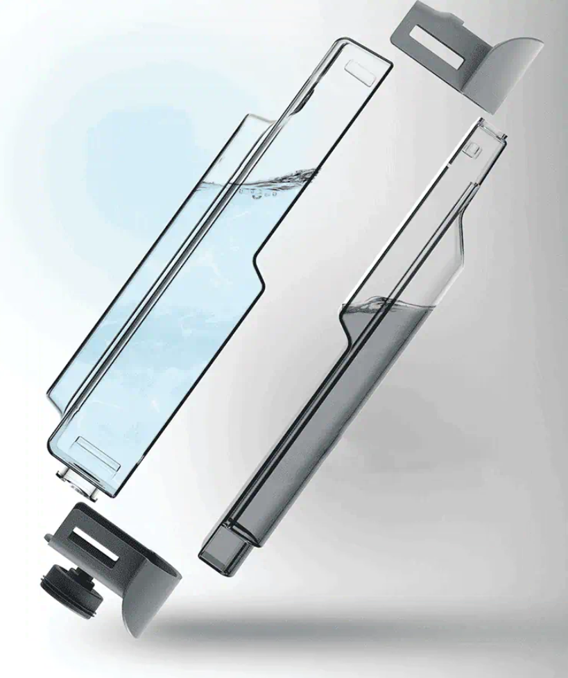 물탱크가 이중으로 되어 있습니다. 깨끗한 물은 계속 공급하더 더러워진 물은 회수를 해 별도 통에 보관을 하는 방식입니다. 물걸레는 때어낸 다음에 빨아 주면 되지만 브러쉬는 그러기 어렵습니다. 그래서 청소가 끝나면 걸레 받침대에 놓고 브러쉬를 돌려 청소를 하는 방식으로 보입니다. 정수 탱크 용량은 400ml / 오수 탱크 용량은 250ml입니다.