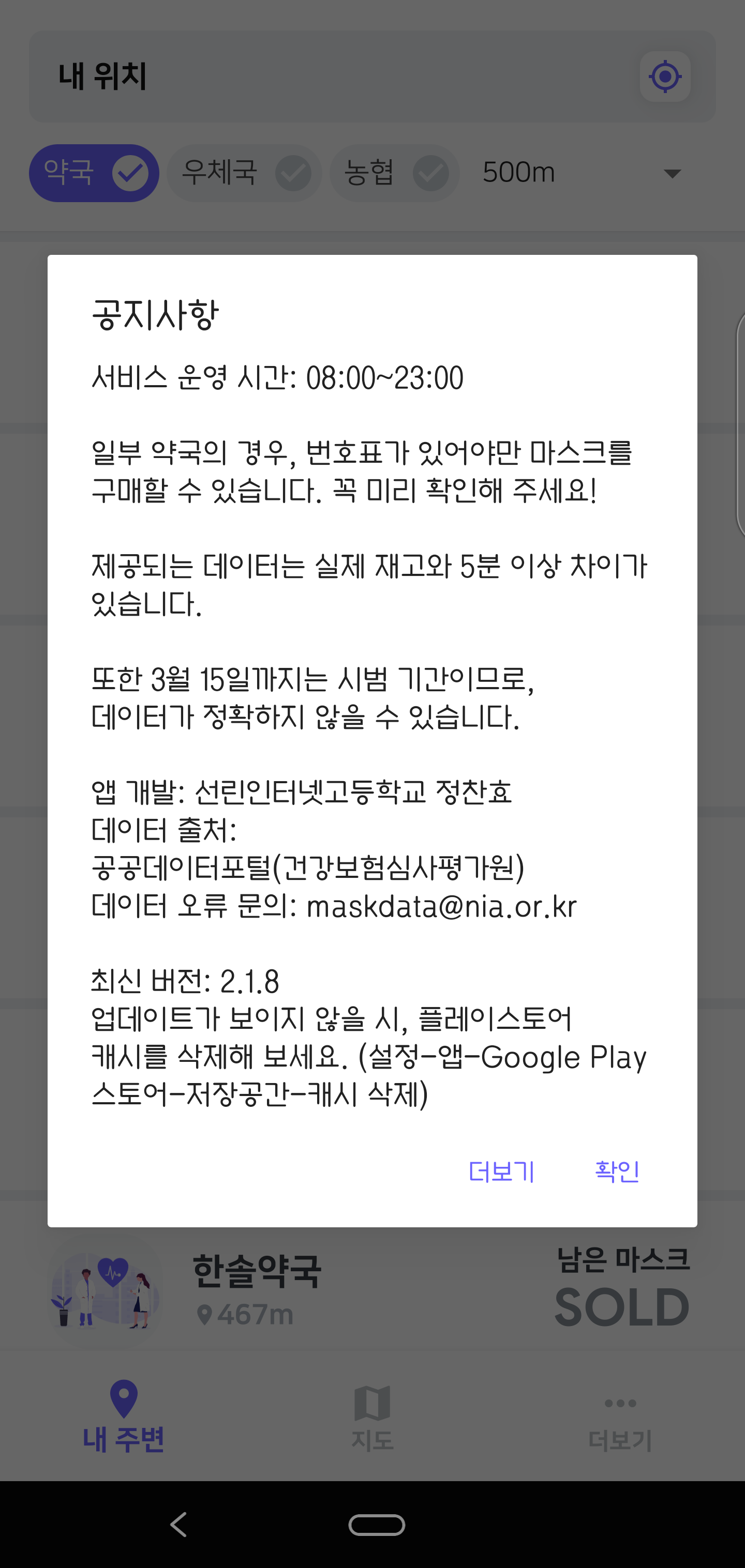 일단은 공적마스크 재고를 약국 정보만 확인이 가능한거 같습니다. 우체국과 농협 데이터는 현재 준비 단계라 확인이 안되고 있습니다.