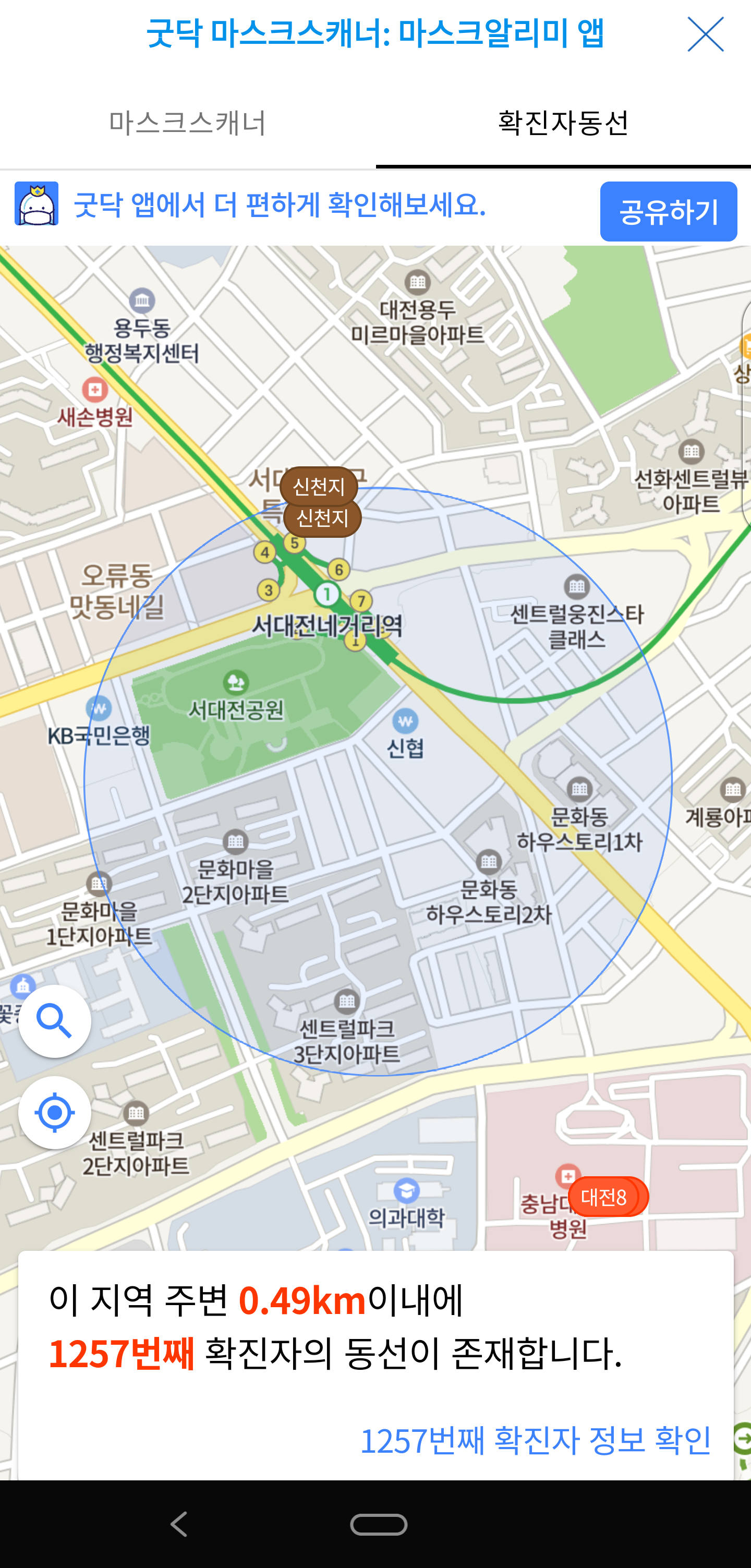 굿닥은 지도를 통해 약국 별로 남은 수량이 색으로 표현되어 있어 보기 편합니다. 초록색은 100장 이상 충분 / 주황색은 30-99장 보통 / 빨강은 30매 미만으로 부족 / 회색은 마스크 재고가 없는 상태입니다. 굿닥 앱의 장점은 확진자 동선은 물론 약국과 병원 위치를 지도로 확인할 수 있습니다.