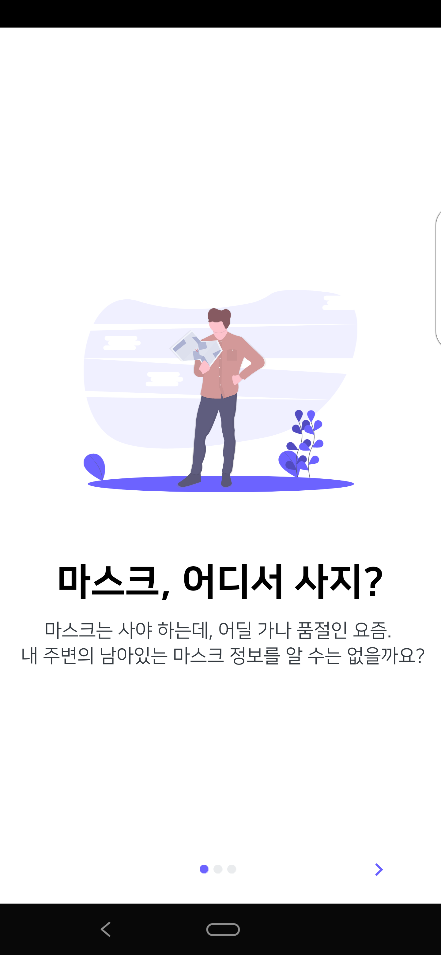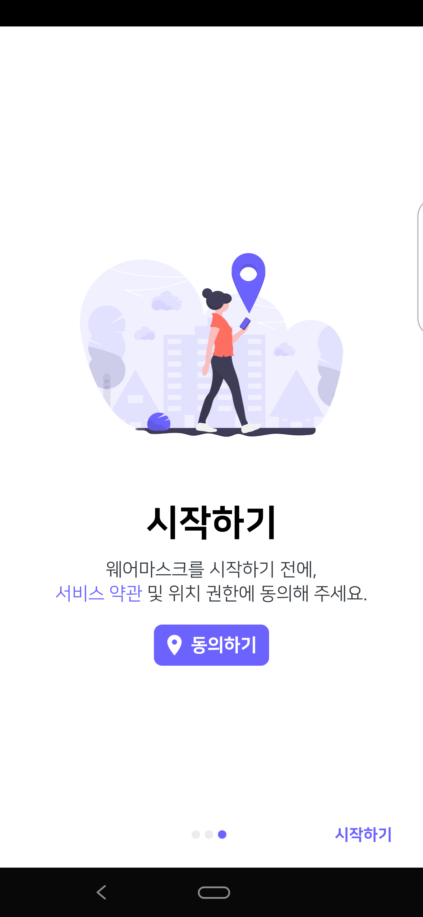앱을 설치하고 실행을 하면 간단한 설명이 나옵니다. 마스크를 사야 하는데 품절이고 그럴때는 앱을 활용해 주변 마스크 재고 정보를 확인할 수 있다는 내용입니다. 앱을 시작하기 전에 간단한 서비스 약관 동의를 해야 합니다. 그리고 위치 액세스를 할지 물어보는 말이 나오는데, 편리한 기능이긴 하지만 불안하기 때문에 앱 사용중에만 할 수 있도록 했습니다.