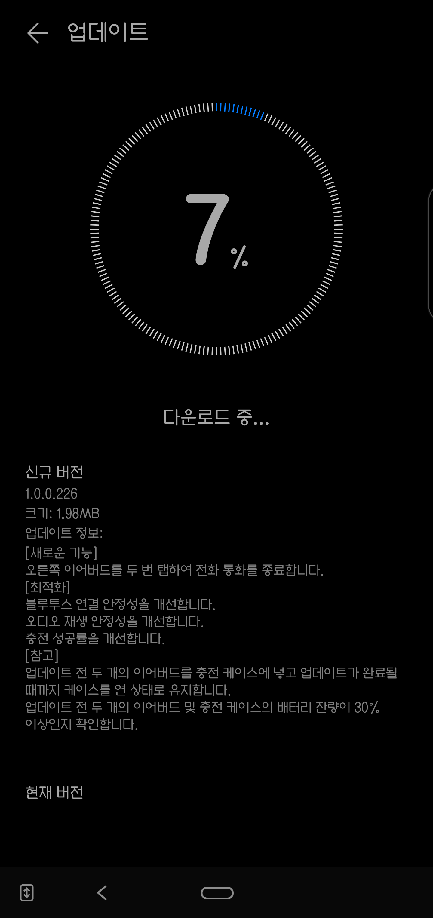 연결을 하니 바로 업데이트를 하라는 메세지가 나옵니다. 업데이트를 하기 위해서는 이어폰을 케이스에 넣어야 하며 배터리 잔량이 있어야 합니다. 그래서 저는 충전을 하면서 업데이트를 진행했습니다.