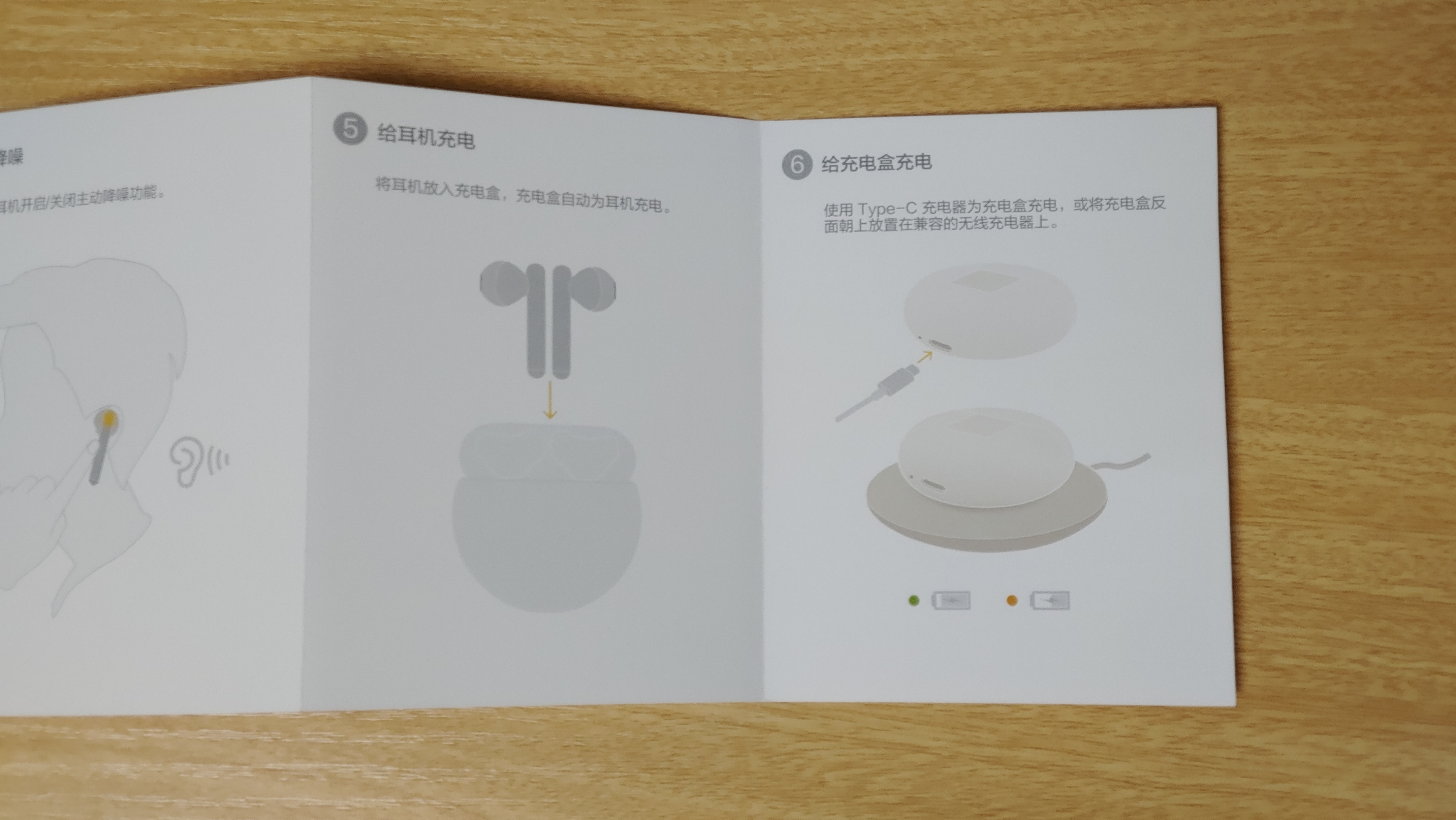 케이스와 본체 색상이 검정색인데, 충전 케이블은 흰색이 들어 있습니다. 같은 색으로 맞춰 주면 좋을거 같은데, 조금은 아쉬운 부분입니다. 설명서를 잠깐 살펴 보면 직구한 제품이라 언어는 중국어로 써 있어 그림만 봅니다. 그림만 봐도 대충 이해가 가는데, 충전 방식이 포트 연결과 무선이 있으며, LED 색상에 따라 충전중인지 아닌지 확인이 가능한거 같습니다.
