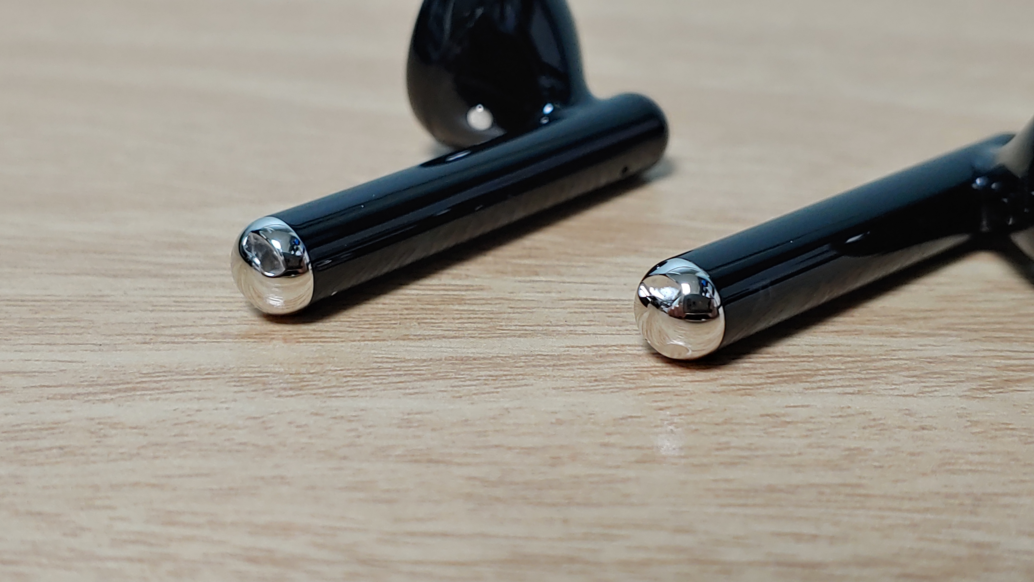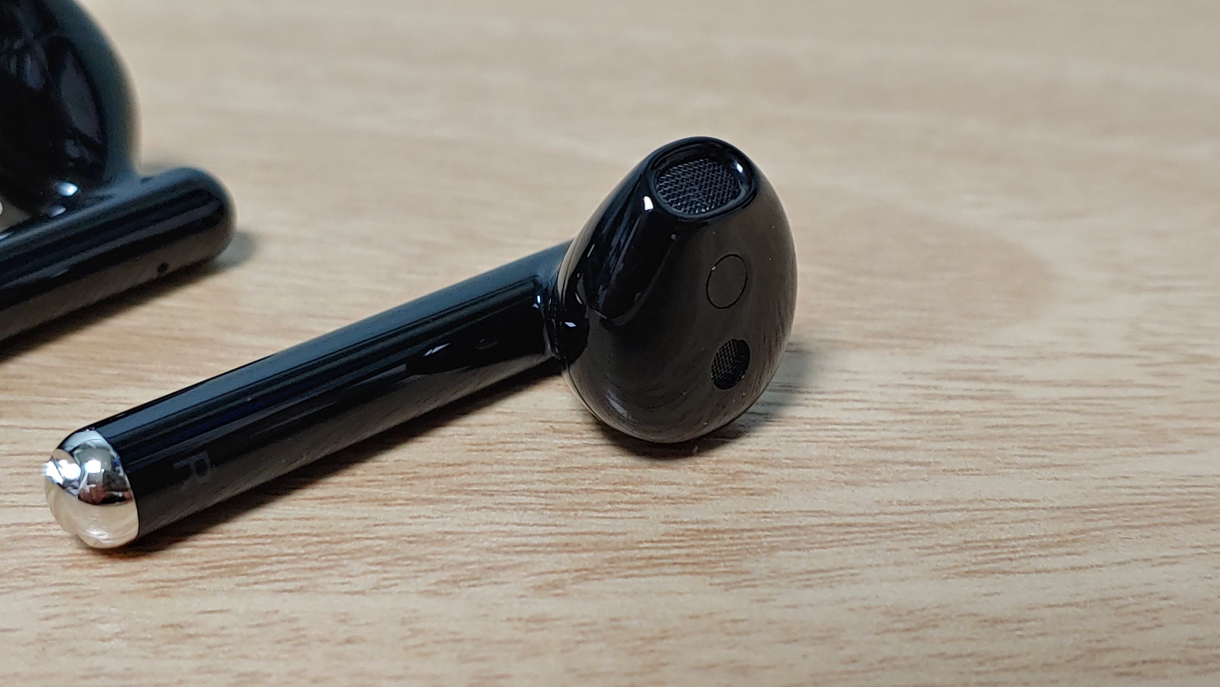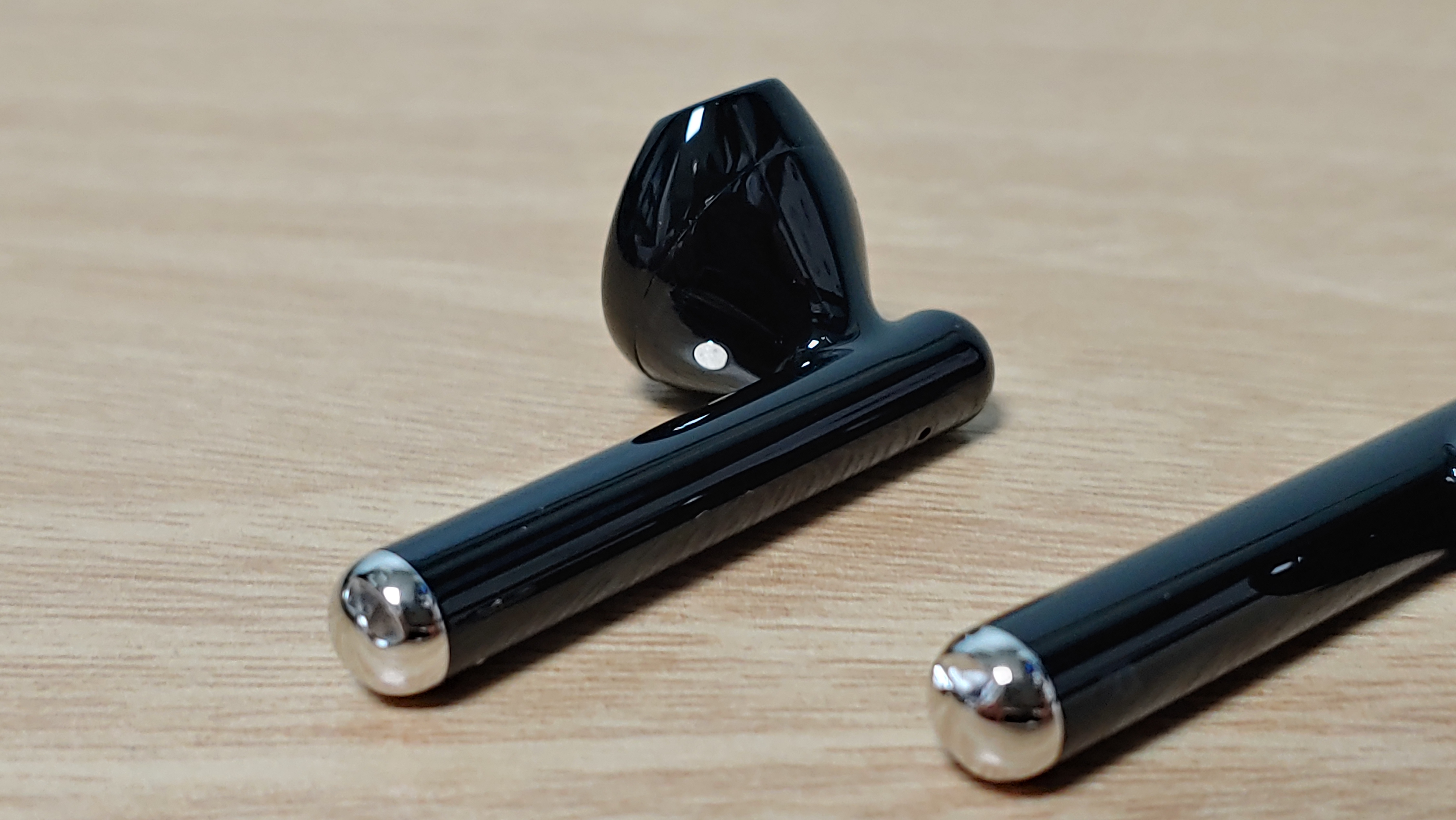 다음은 이어폰 본체를 보겠습니다. 명칭을 뭐하고 해야 할지 모르겠지만 이어폰 봉이 위쪽으로 조금 튀어나온 디자인입니다. 그외에는 기존 제품이나 에어팟과 유사합니다.