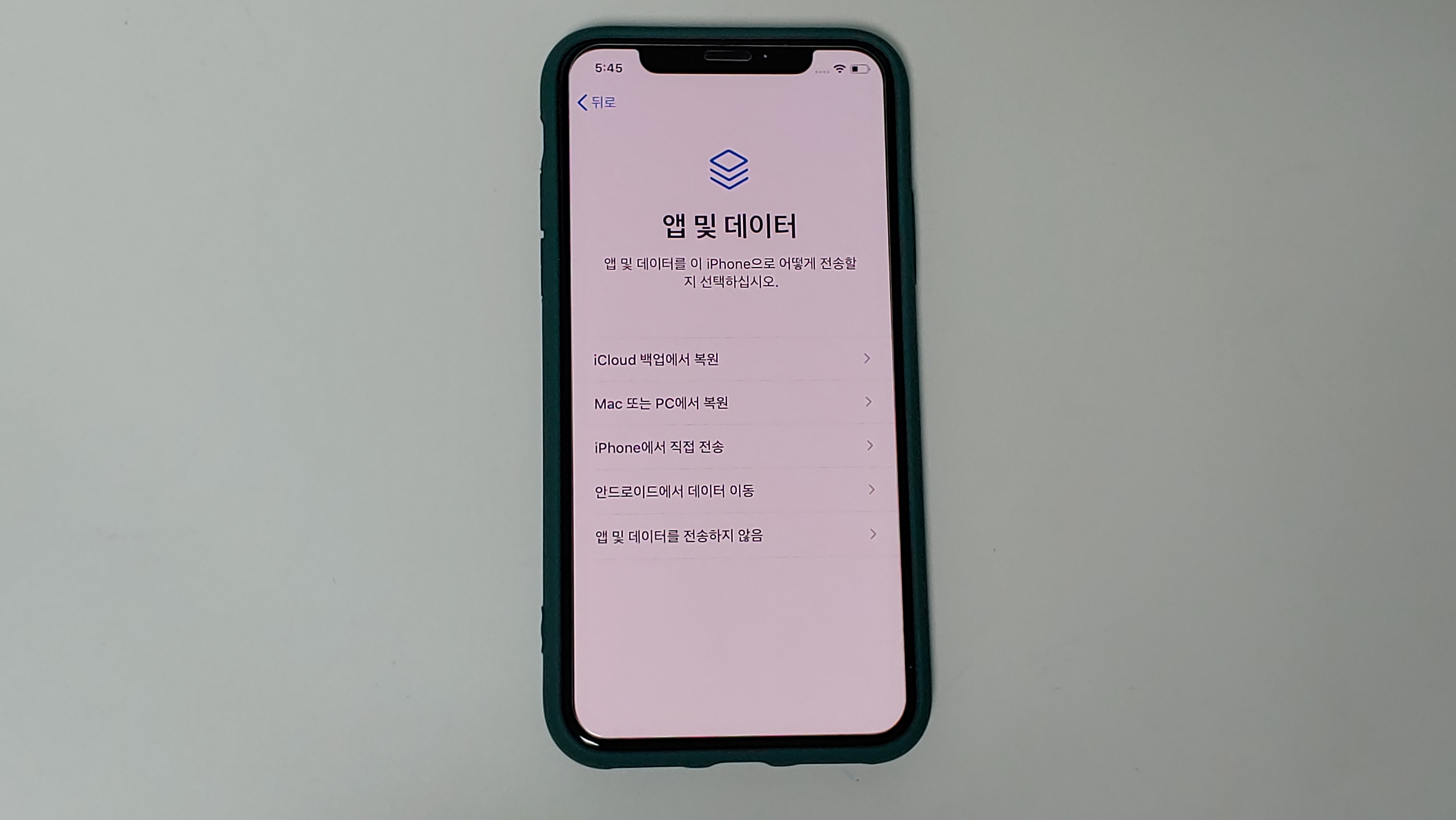아이폰을 초기화 하고 나면 새로 구입했을 때 처럼 초기 화면이 나옵니다. 그러면 앱 및 데이터 메뉴가 나올때 까지 설정을 해주세요.