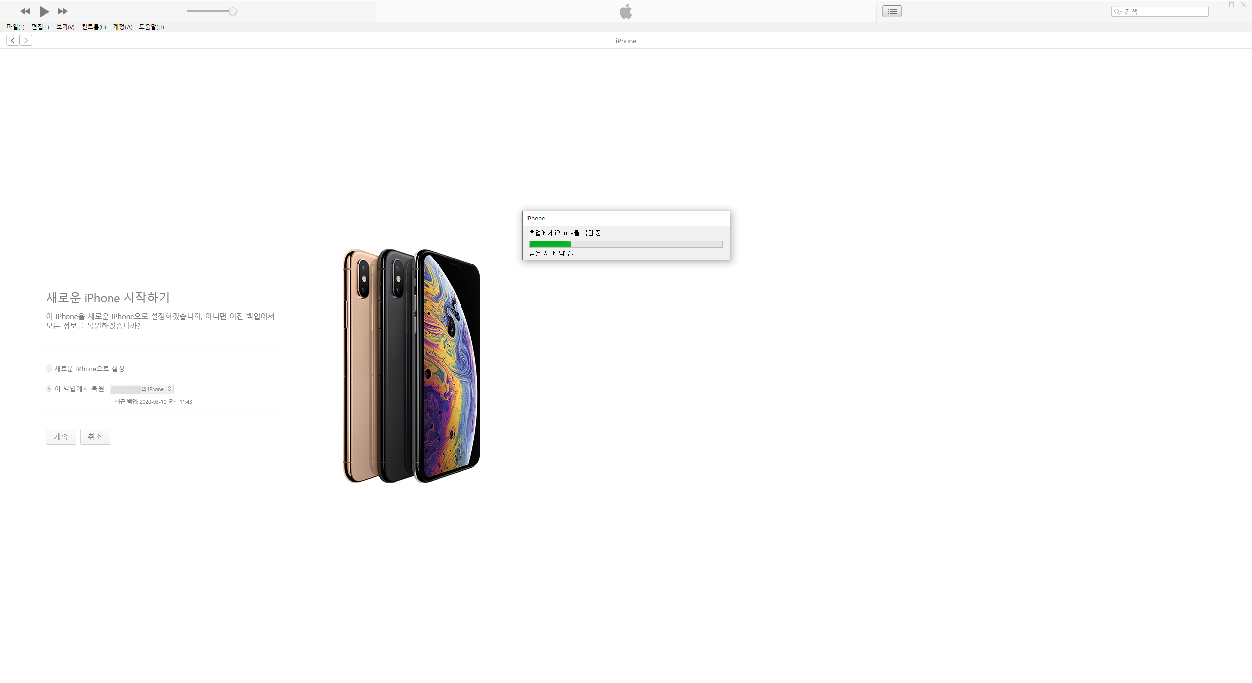 이제는 PC에 아이폰을 연결해 주면 아이튠즈가 실행됩니다. 그것에서 기존에 백업 받은 데이터를 새로운 아이폰에 복원하면 됩니다.