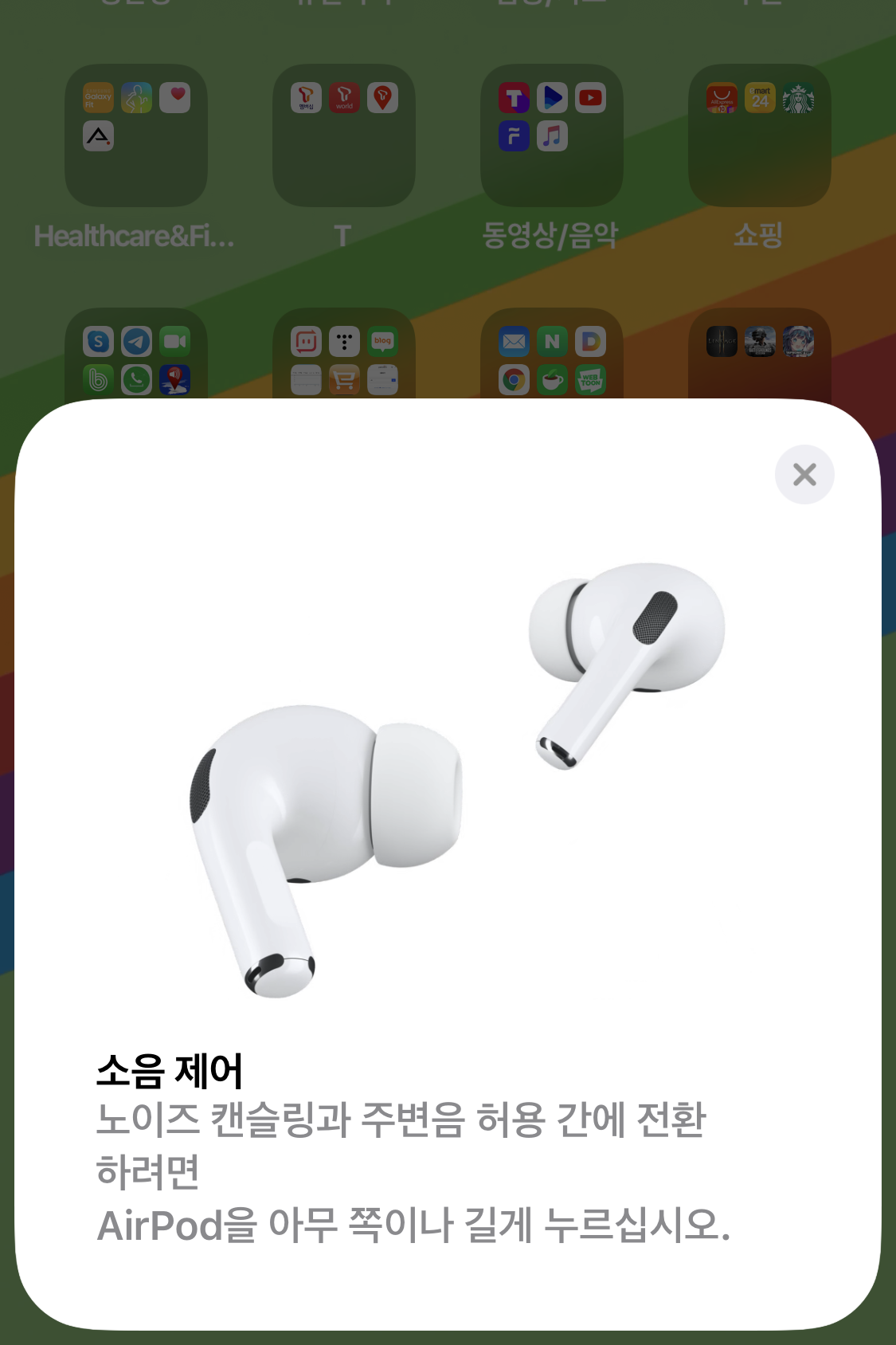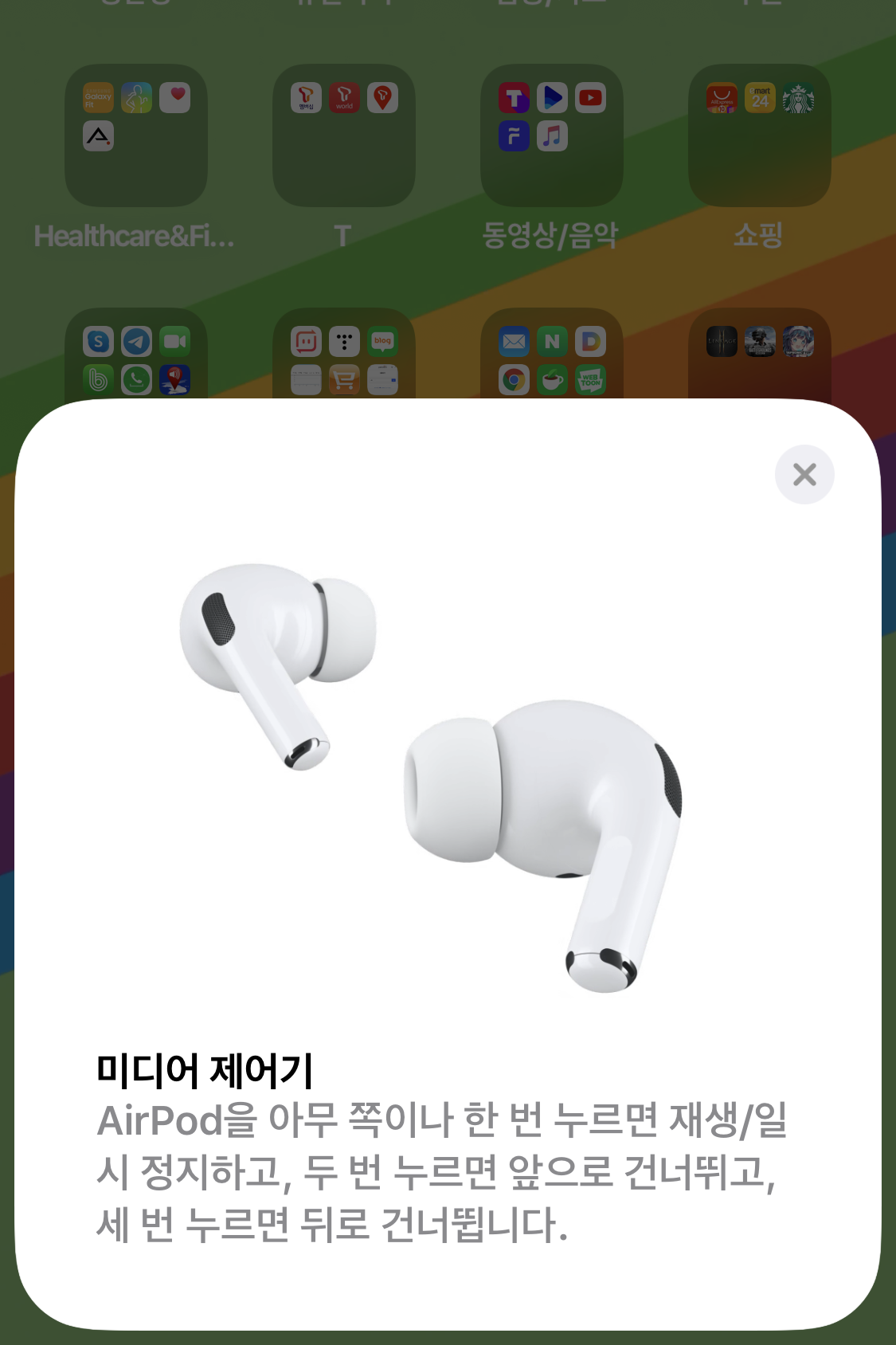 에어팟 프로 케이스 뚜껑을 열면 아이폰에서 위와 같은 화면이 나옵니다. 설정에서 블루투스 메뉴 찾아서 연결하지 않아도 되서 정말 편리합니다. 기존 에어팟은 터치 방식으로 컨트롤을 했는데, 프로는 하단에 버튼이 있습니다. 재생, 일시정지는 기존에 있던 기능인데, 건너뛰기와 뒤로 건너뛰기가 생겼습니다. 그리고 길게 누르면 노이즈 캔슬링 기능을 켜거나 끌 수 있습니다.