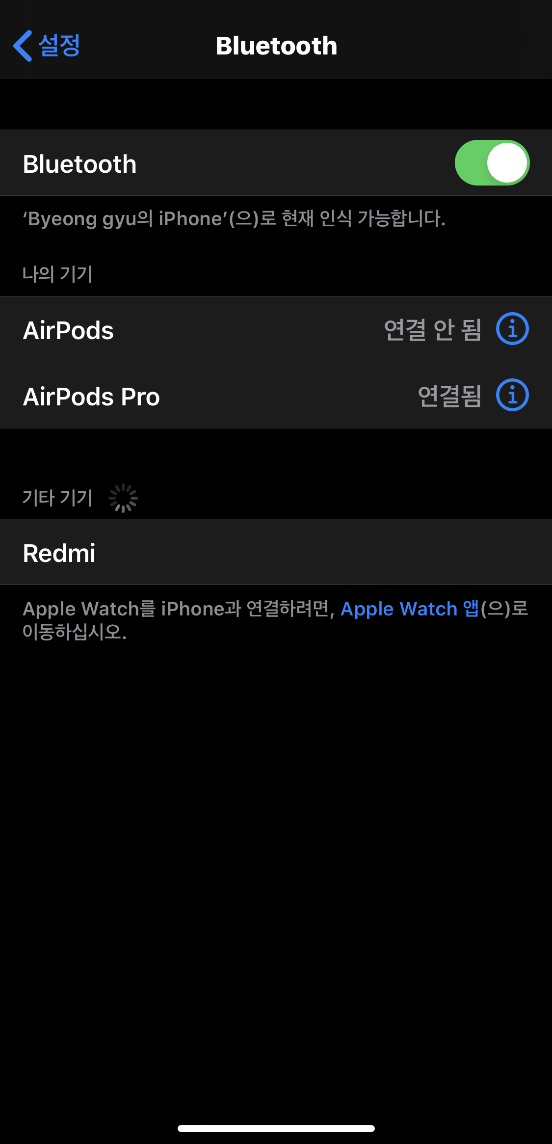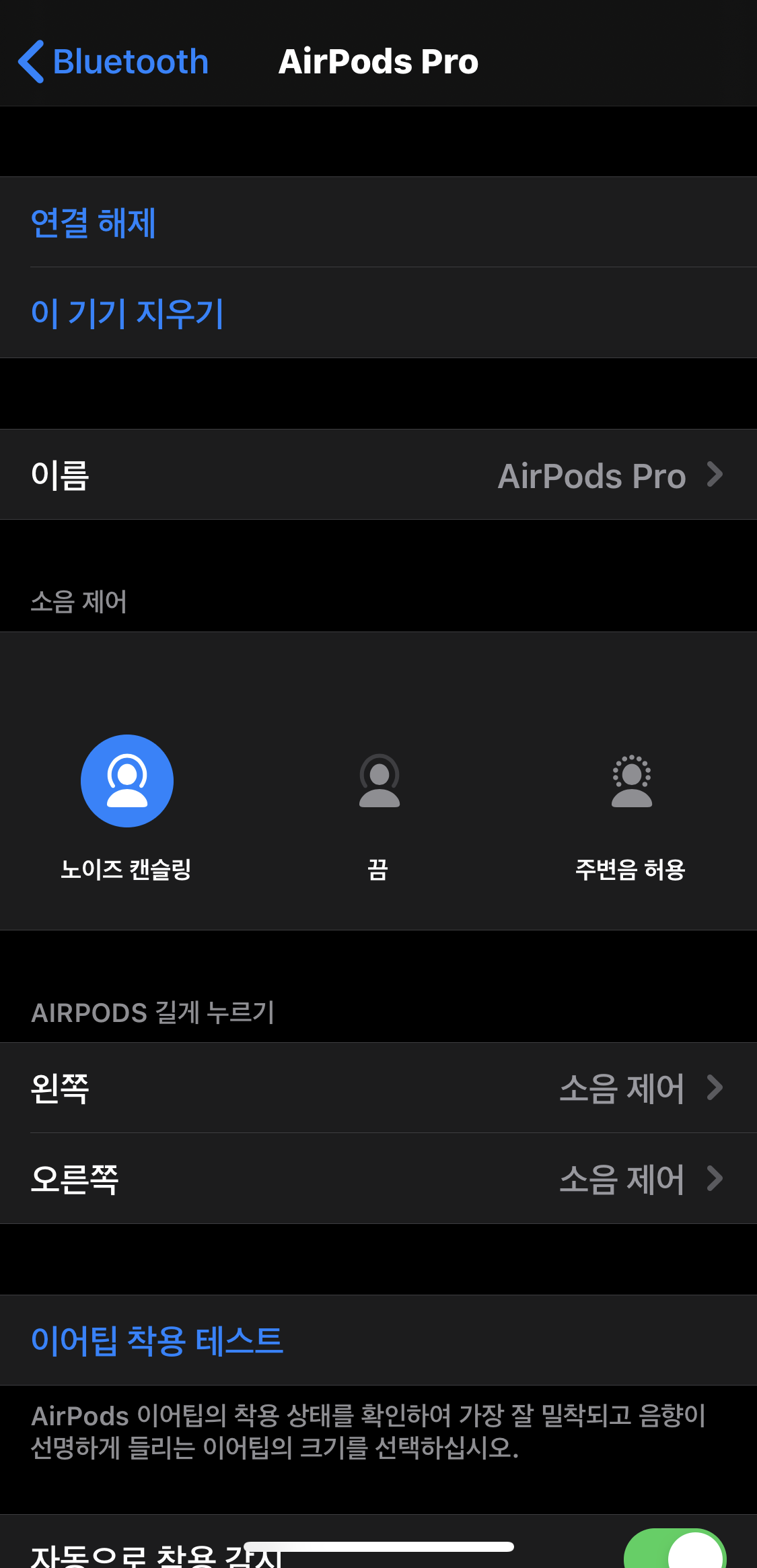 블루투스 메뉴에서 설정이 가능합니다. AirPods Pro 연결됨 옆에 있는 i를 눌러 주세요. 그러면 오른쪽과 같이 설정 메뉴에 들어갈 수 있습니다.