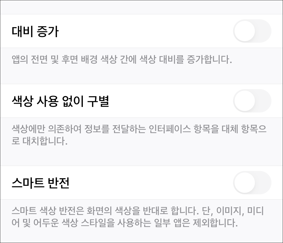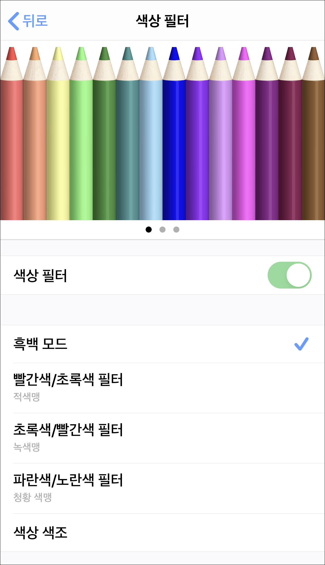 색상필터 메뉴는 색맹인 분들을 위한 메뉴입니다. 다양한 사용자를 위한 애플의 배려가 돋보입니다.