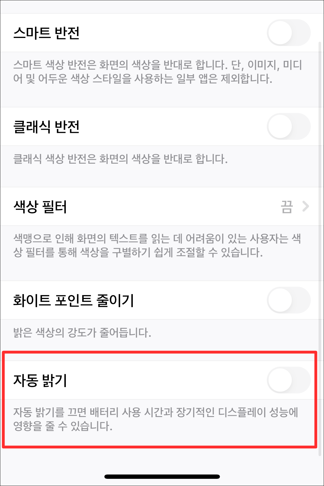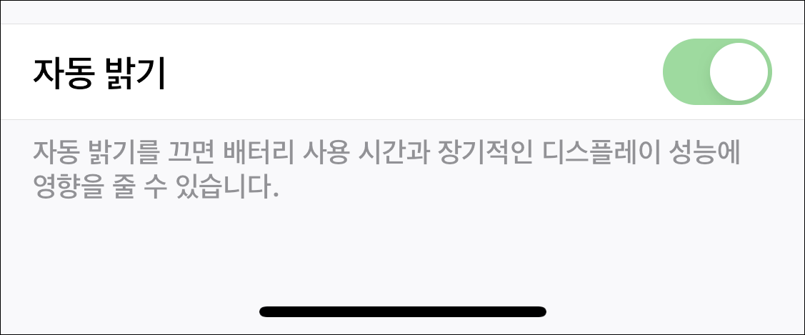 스마트폰을 밝은 곳에서도 사용을 하지만 어두운 곳에서도 사용을 합니다. 밝은 곳에서는 디스플레이가 밝아야 화면이 선명하게 보입니다. 어두운 곳에서도 밝으면 화면이 선명하게 보이는 것은 마찬가지이지만, 어두운 곳에서 너무 밝은 빛은 눈을 쉽게 피로하게 합니다. 아이폰을 사용하면서 상황에 따라 수동으로 밝기를 조절할 수 있지만, 불편합니다. 그래서 자동밝기 설정을 하면 주변 밝기에 따라 디스플레이의 밝기를 자동으로 조절해줘 편리한 사용이 가능합니다.