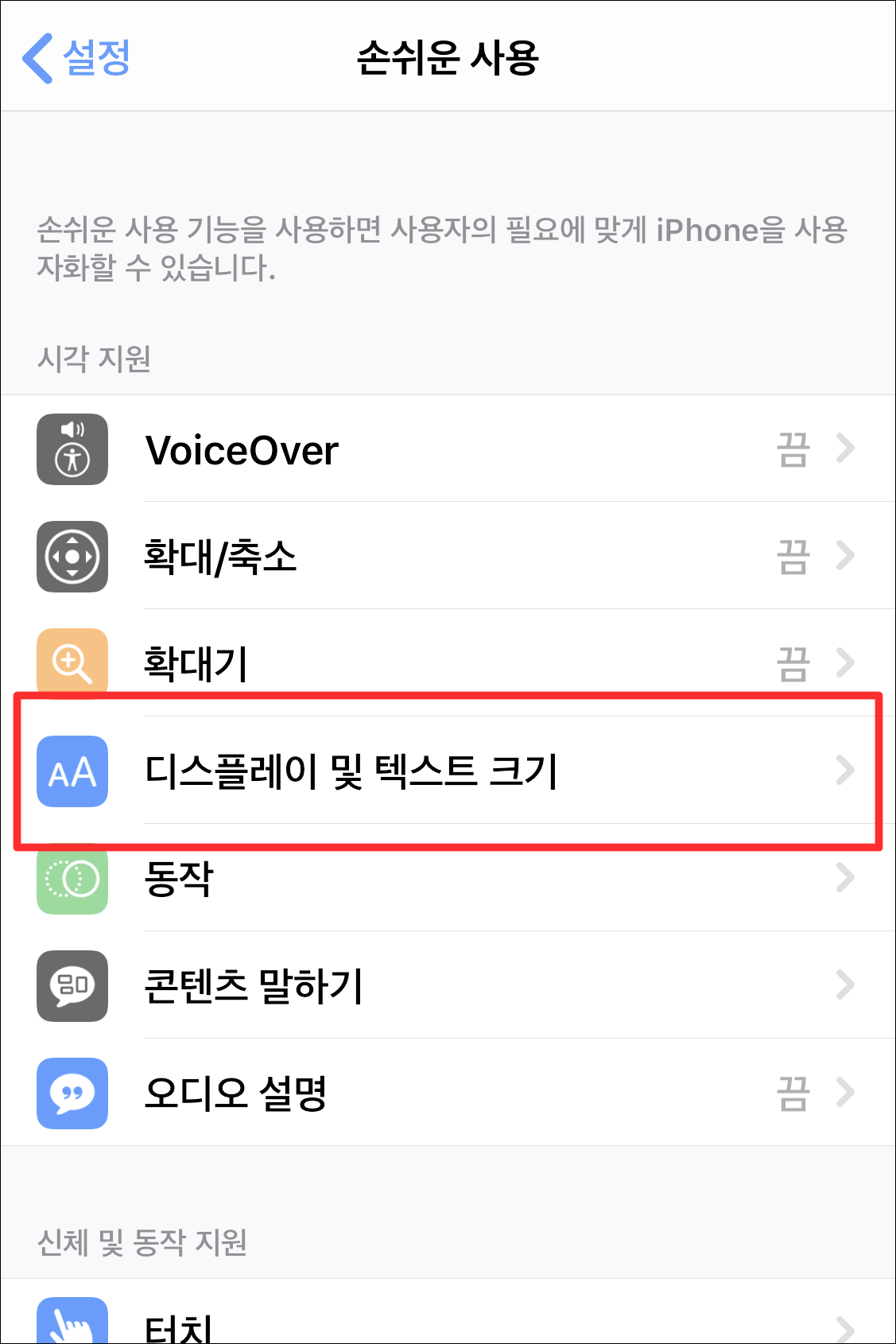 아이폰 자동밝기를 끄거나 켜는 것은 설정에 보면 손쉬운 사용 메뉴에 있습니다. 왠지 그 위에 있는 디스플레이 및 밝기 메뉴가 있을거 같은데, 손쉬운 사용으로 가야 합니다. 손쉬운 사용에 들어가면 디스플레이 및 텍스트 크기 메뉴가 있으며, 가장 하단에 자동밝기를 설정하는 메뉴가 있습니다.