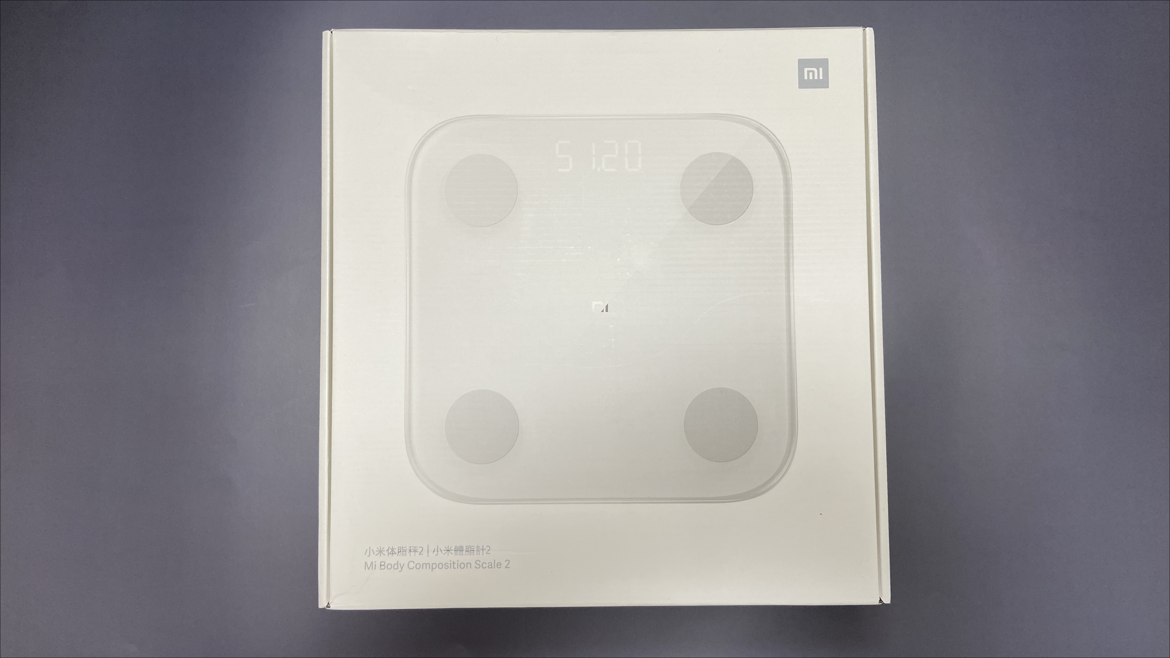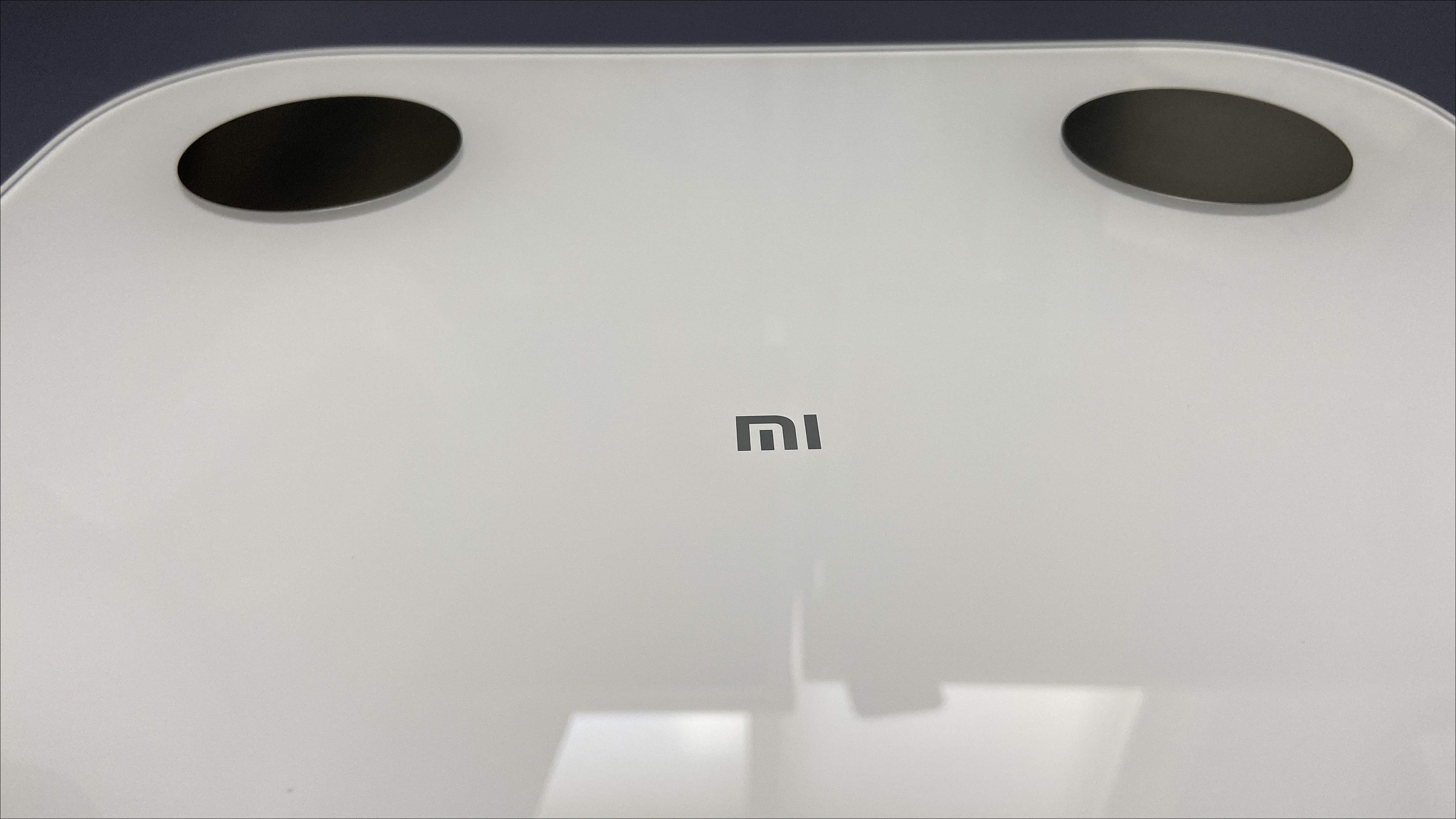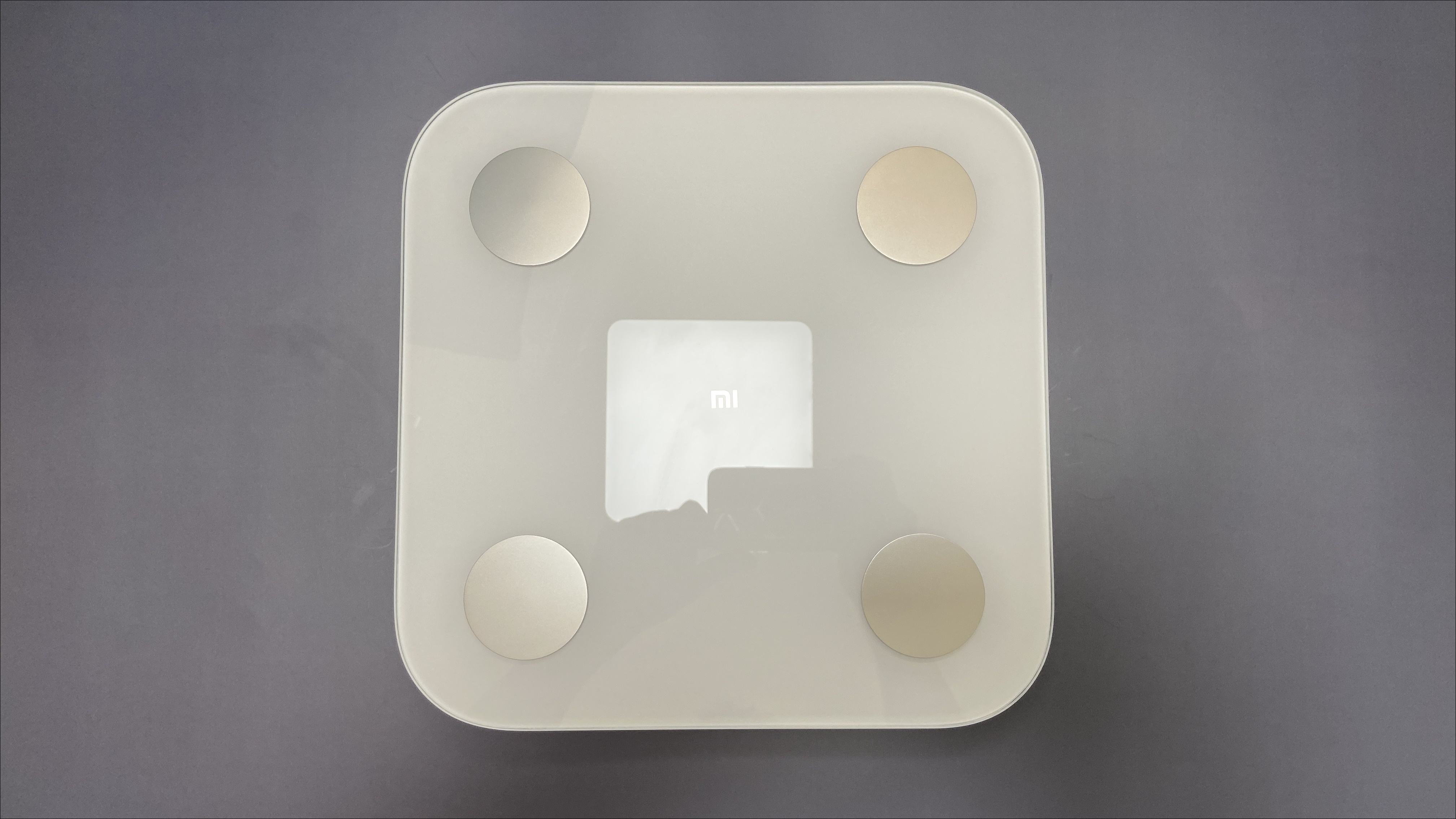 제품 윗면은 유리로 되어 있으며, 4개의 동그란 금속이 있습니다. 4개의 동그란 금속을 이용해 인바디를 측정하는거 같습니다. 가운데는 Mi로고가 들어가 있습니다.