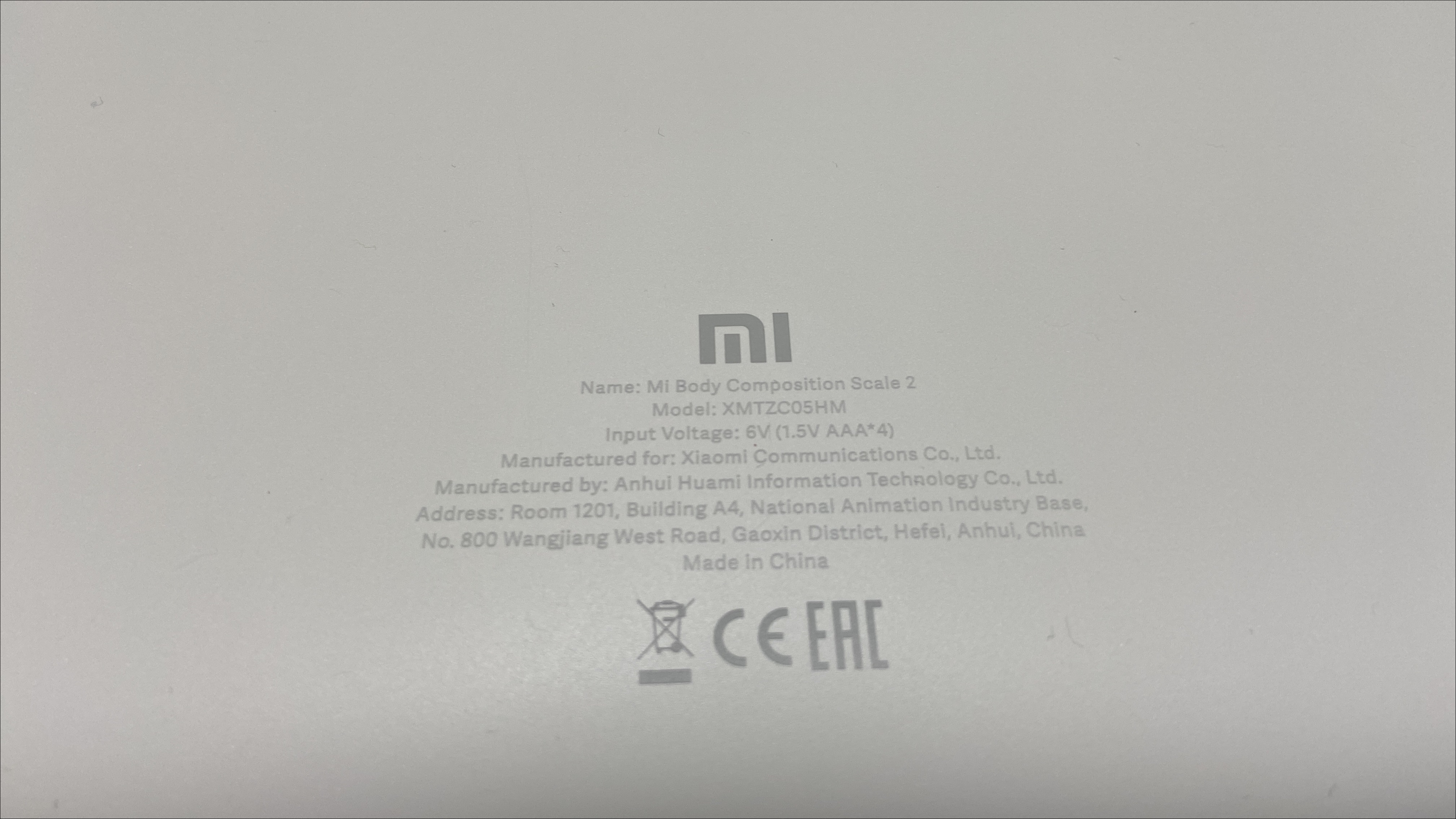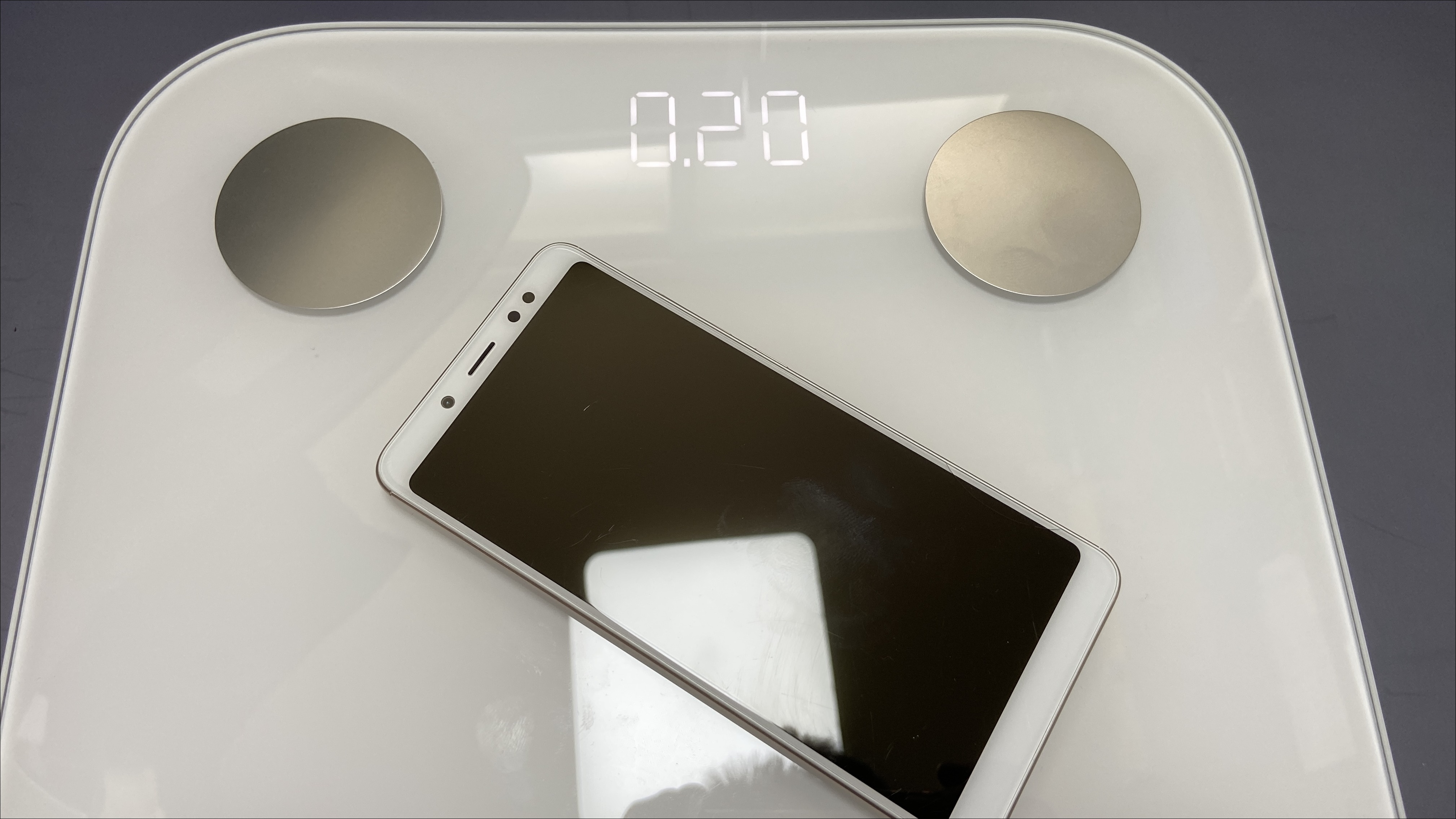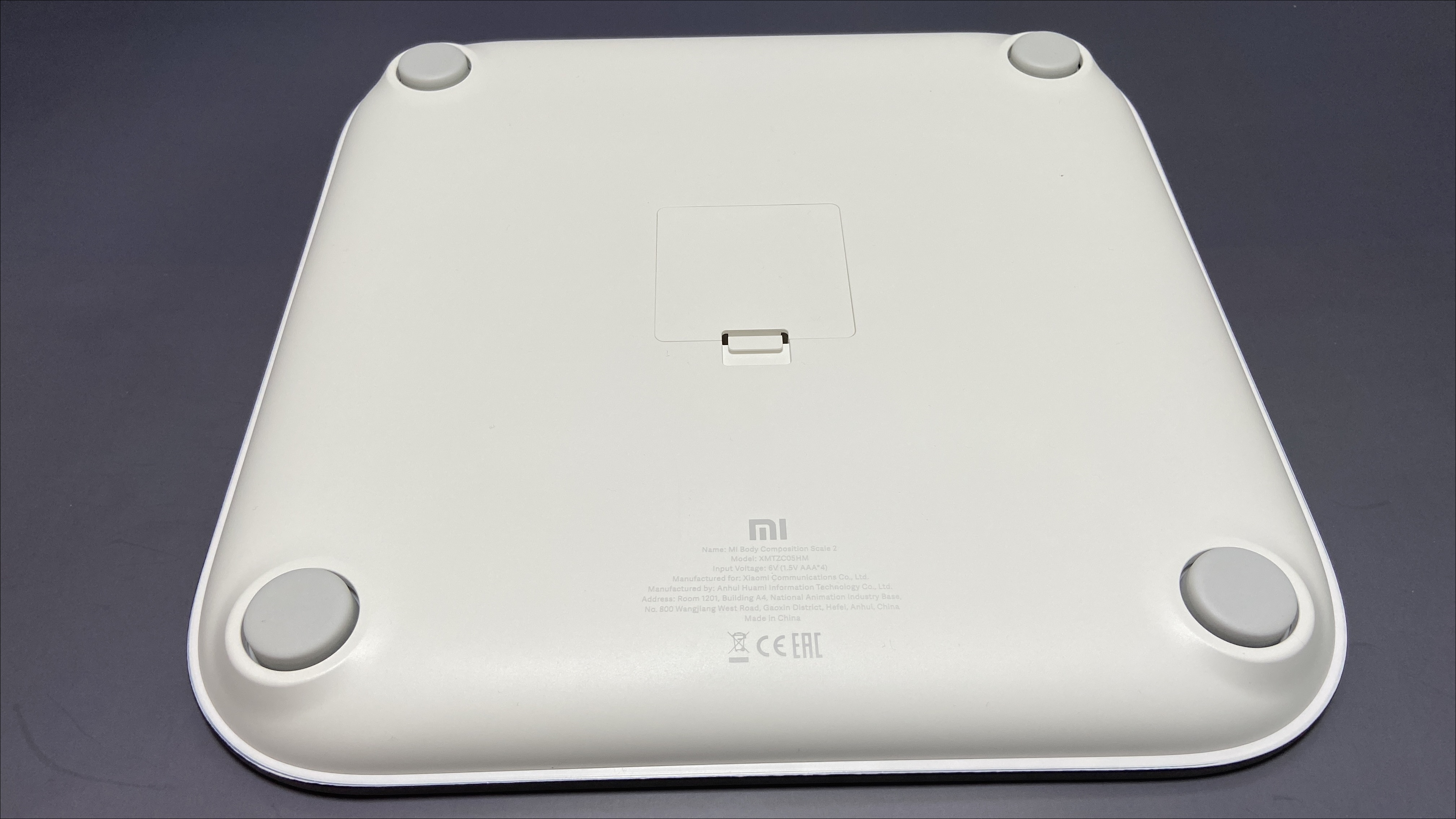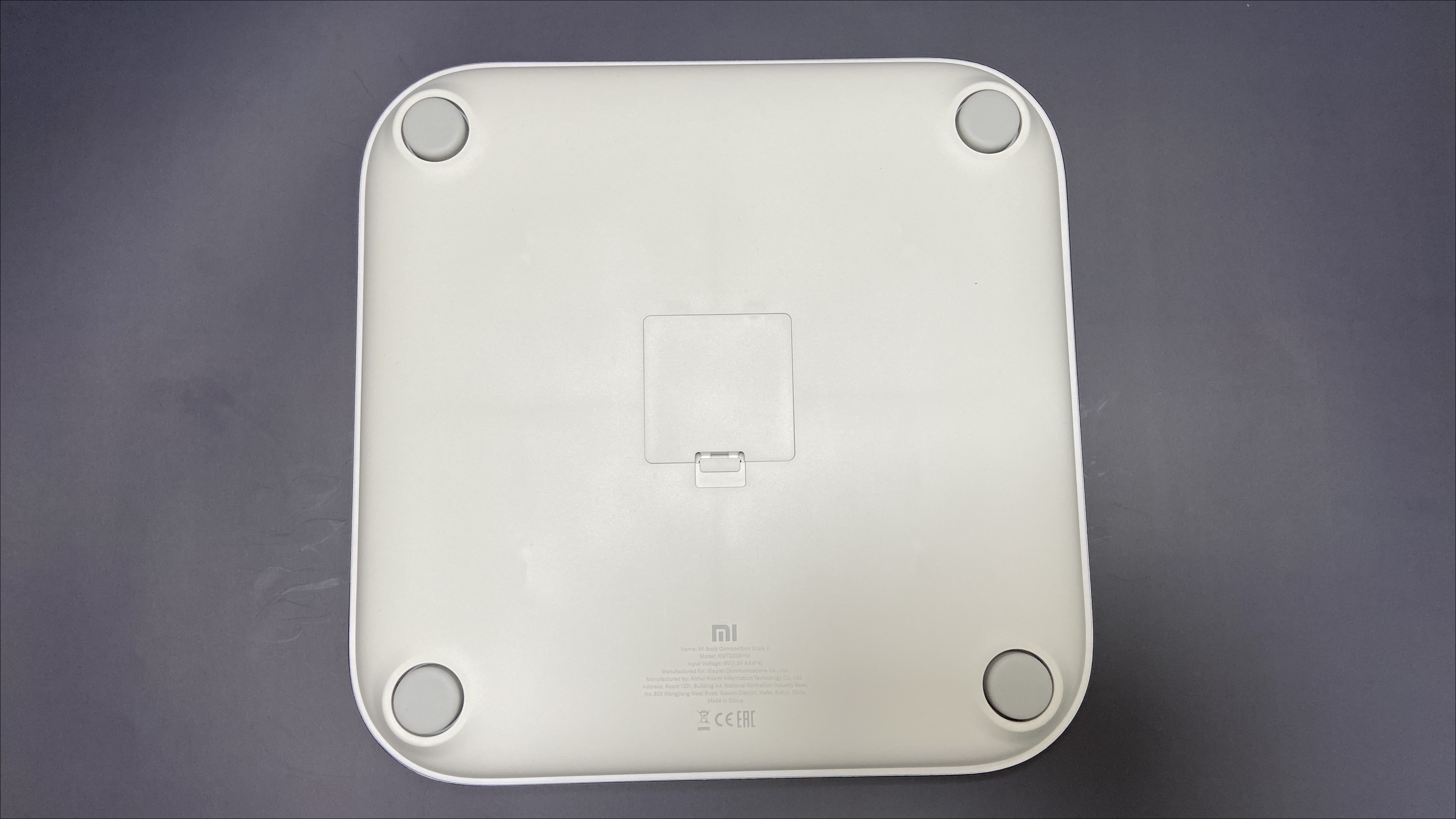 제품 윗면은 유리로 되어 있으며, 4개의 동그란 금속이 있습니다. 4개의 동그란 금속을 이용해 인바디를 측정하는거 같습니다. 가운데는 Mi로고가 들어가 있습니다.