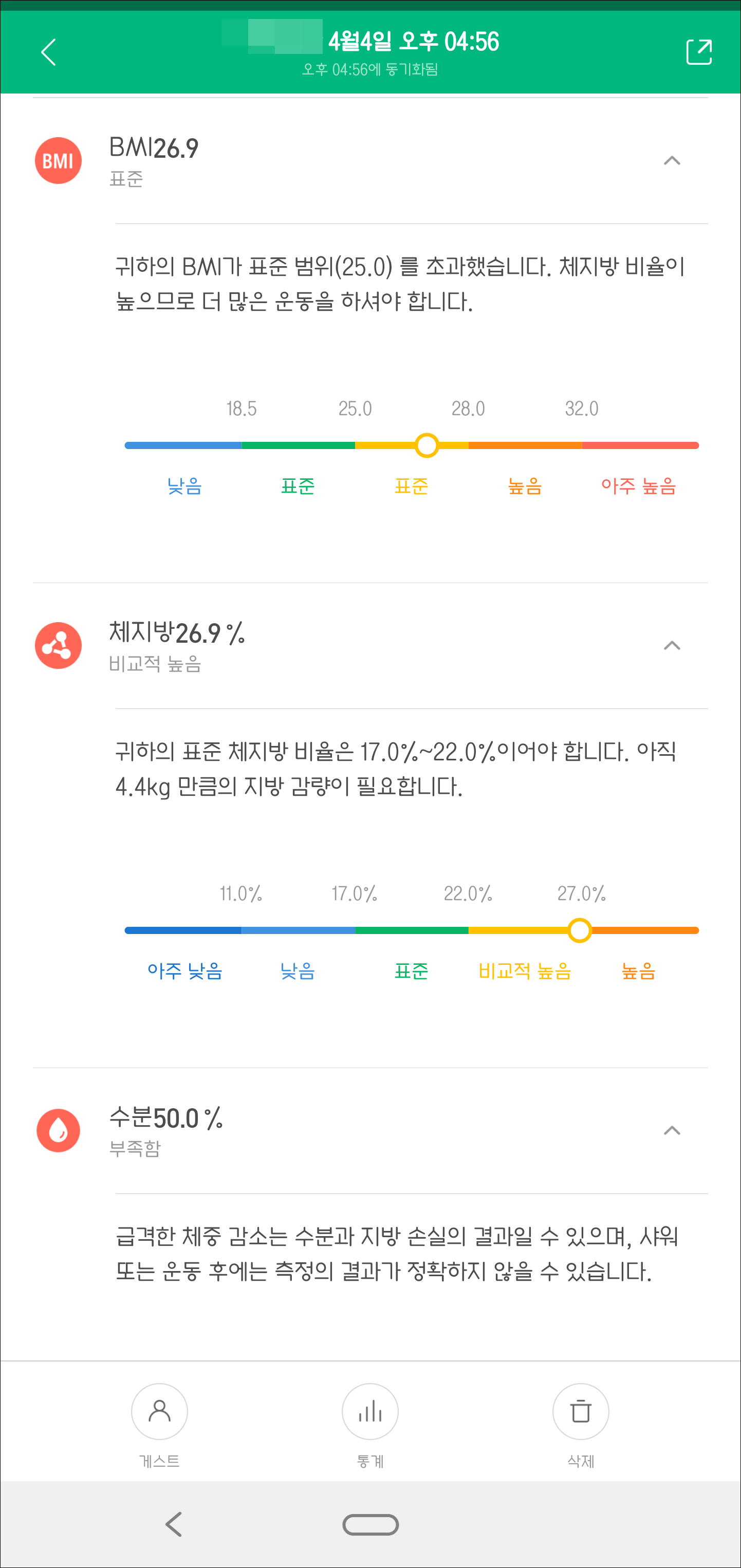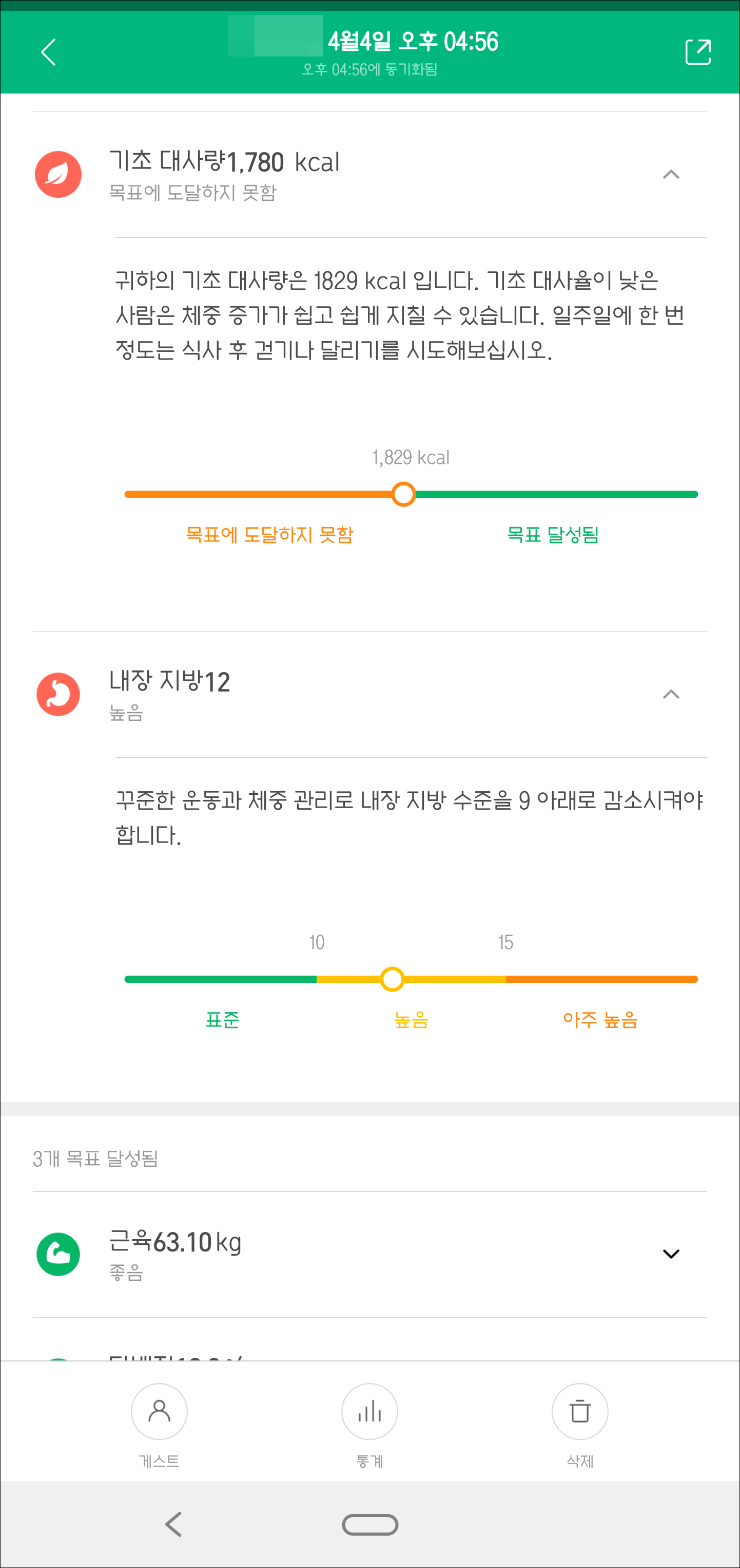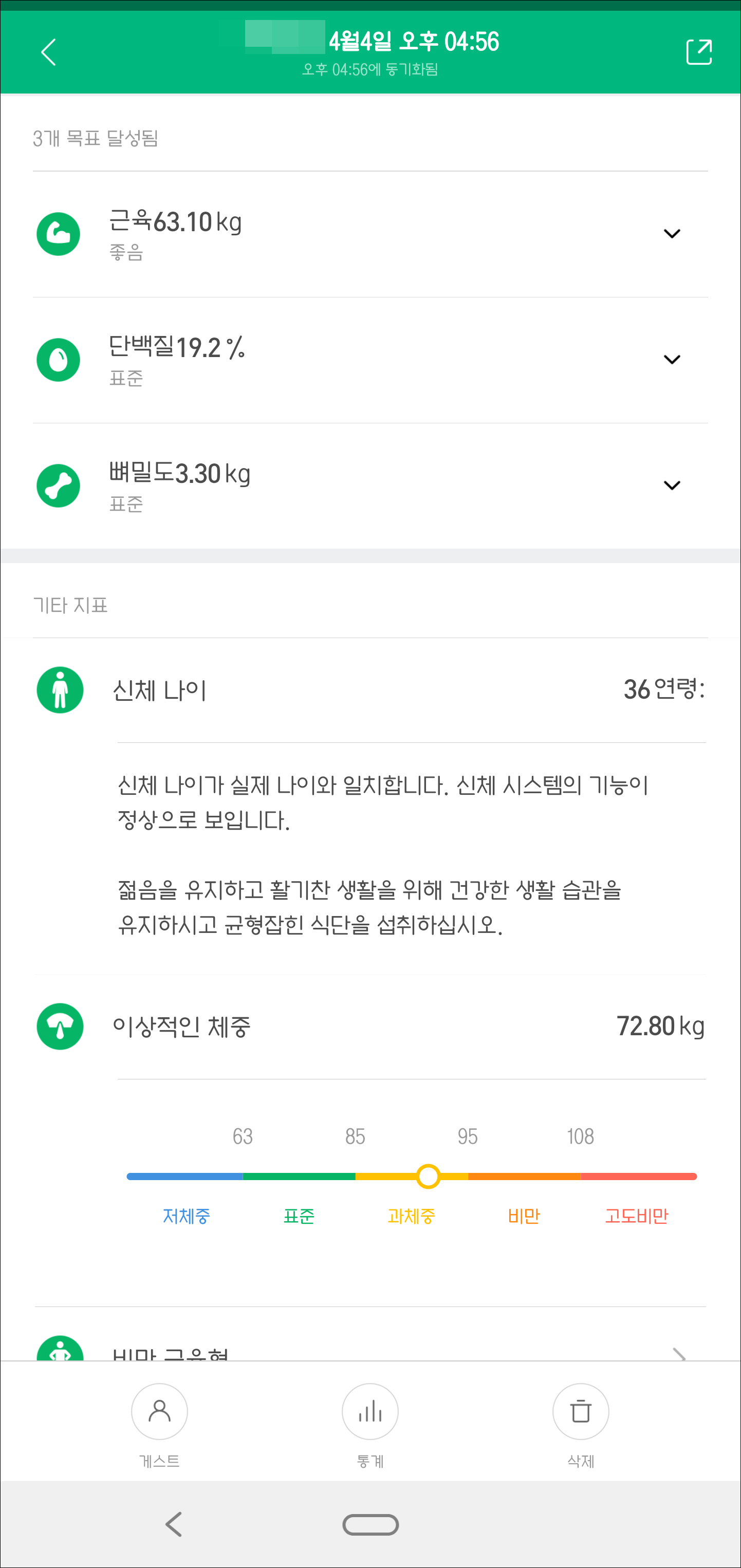 BMI, 체지방, 수분, 기초대사량, 내장 지방, 근육, 신체 나이를 확인할 수 있습니다. 그리고 이상적인 몸무게도 알려 줍니다.