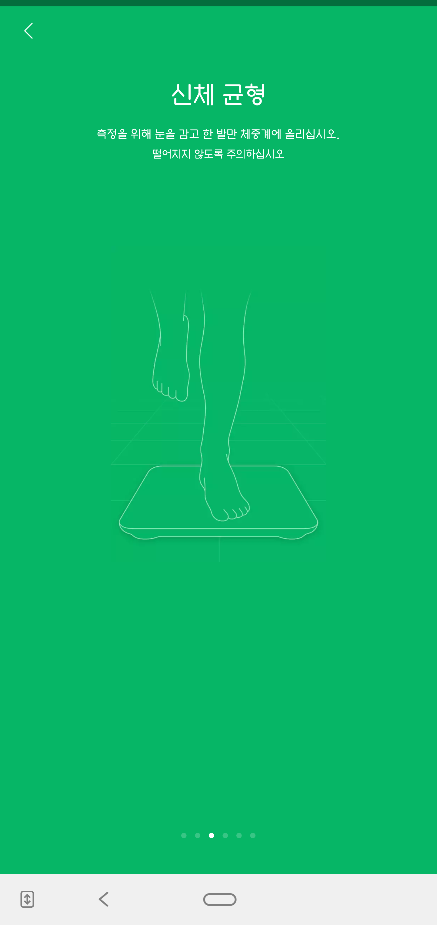 간단한 사용 설명이 앱에 나와 있습니다. 가장 기본인 평평한 곳에 놓고 가벼운 옷차림으로 체중을 측정하라고 안내 되어 있습니다. 무게 단위를 변경할 수 있으며, 신체 균형도 측정이 가능합니다.