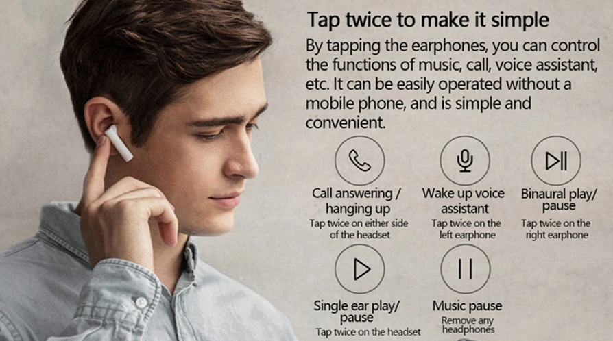 샤오미 에어닷 프로2는 더블탭으로 이어폰 컨트롤이 가능합니다. 기본 설정으로 말씀을 드리면 오른쪽은 음악을 멈추거나 재생을 하거나 또는 전화를 받거나 끊을 때 사용합니다. 왼쪽은 구글 어시스턴트를 호출할 때 사용합니다. 이런 설정은 에어팟 1세대와 동일합니다.