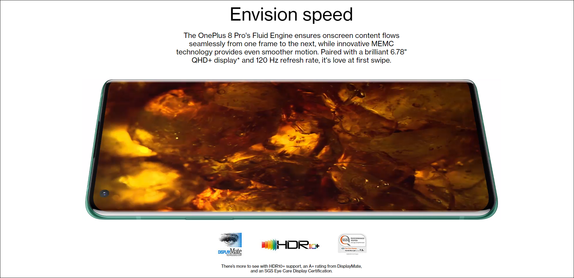 해상도 역시 일반은 FHD+ / 프로는 QHD+로 차이가 있습니다. 삼성의 갤럭시 S20 시리즈에서 고주사율을 사용할 수 있는 해상도가 FHD인데, 원플러스8은 높은 해상도에서도 고주사율 디스플레이를 사용할 수 있습니다.