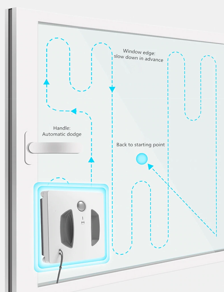 경로를 계획하여 처음과 두번째를 다르게 청소합니다. 그리고 창문의 손잡이 같은 장애물을 인지해서 피해가면서 청소를 합니다.