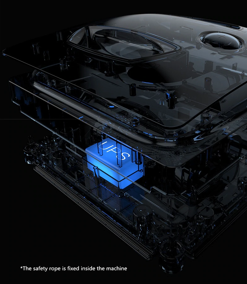 청소를 하는동안 소음을 최소화하는 저소음 설계를 했습니다. 유리창은 물론 타일벽, 목재문 등 다양한 곳에 사용이 가능합니다. 그리고 청소를 하다 전원이 꺼져도 떨어지지 않게 UPS 시스템이 들어갑니다. 갑작스러운 정전에도 20분 정도 사용이 가능합니다. 그리고 로프를 연결도 가능합니다. 2중의 안전 시스템이 들어가 있는 샘입니다.