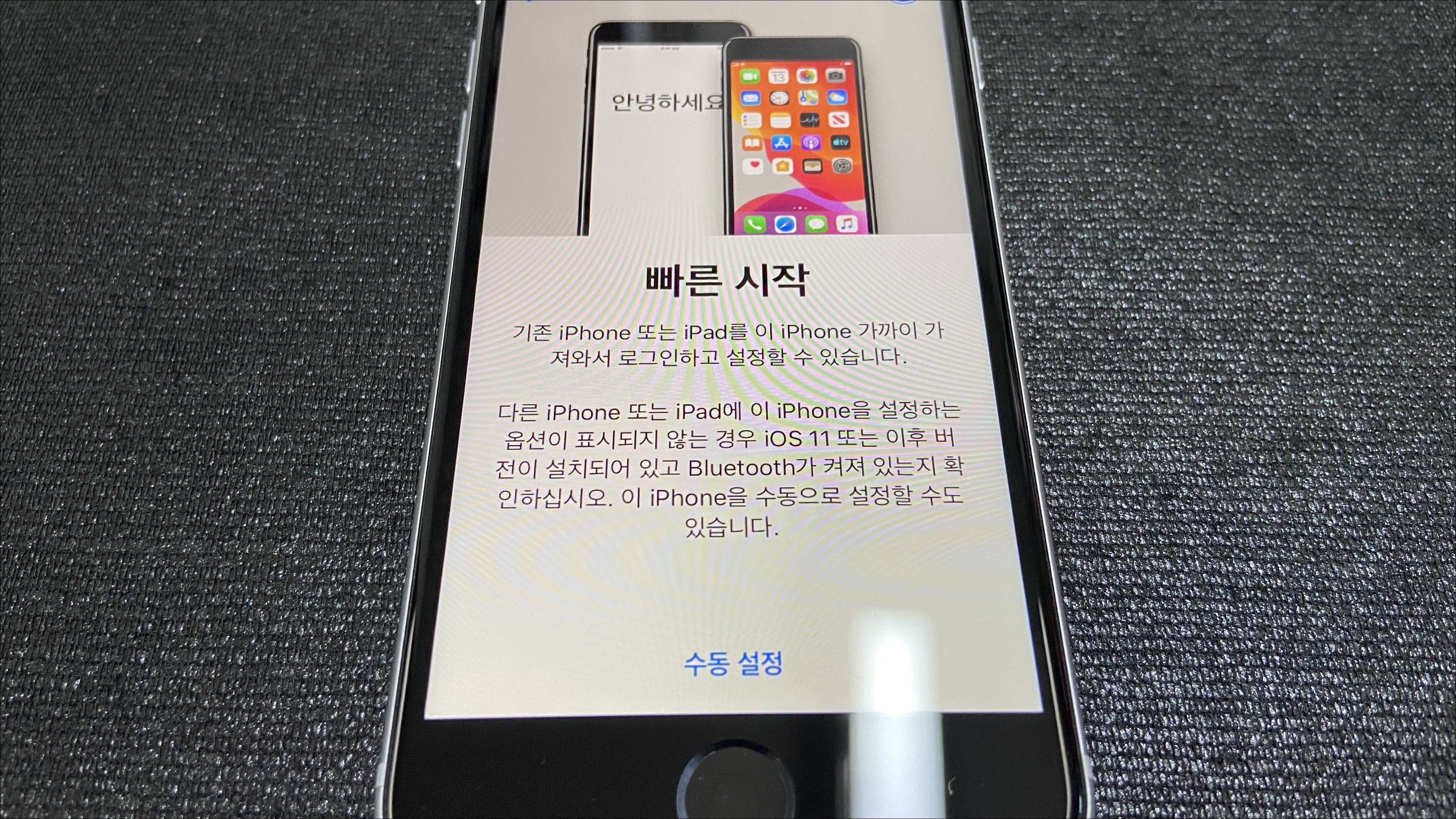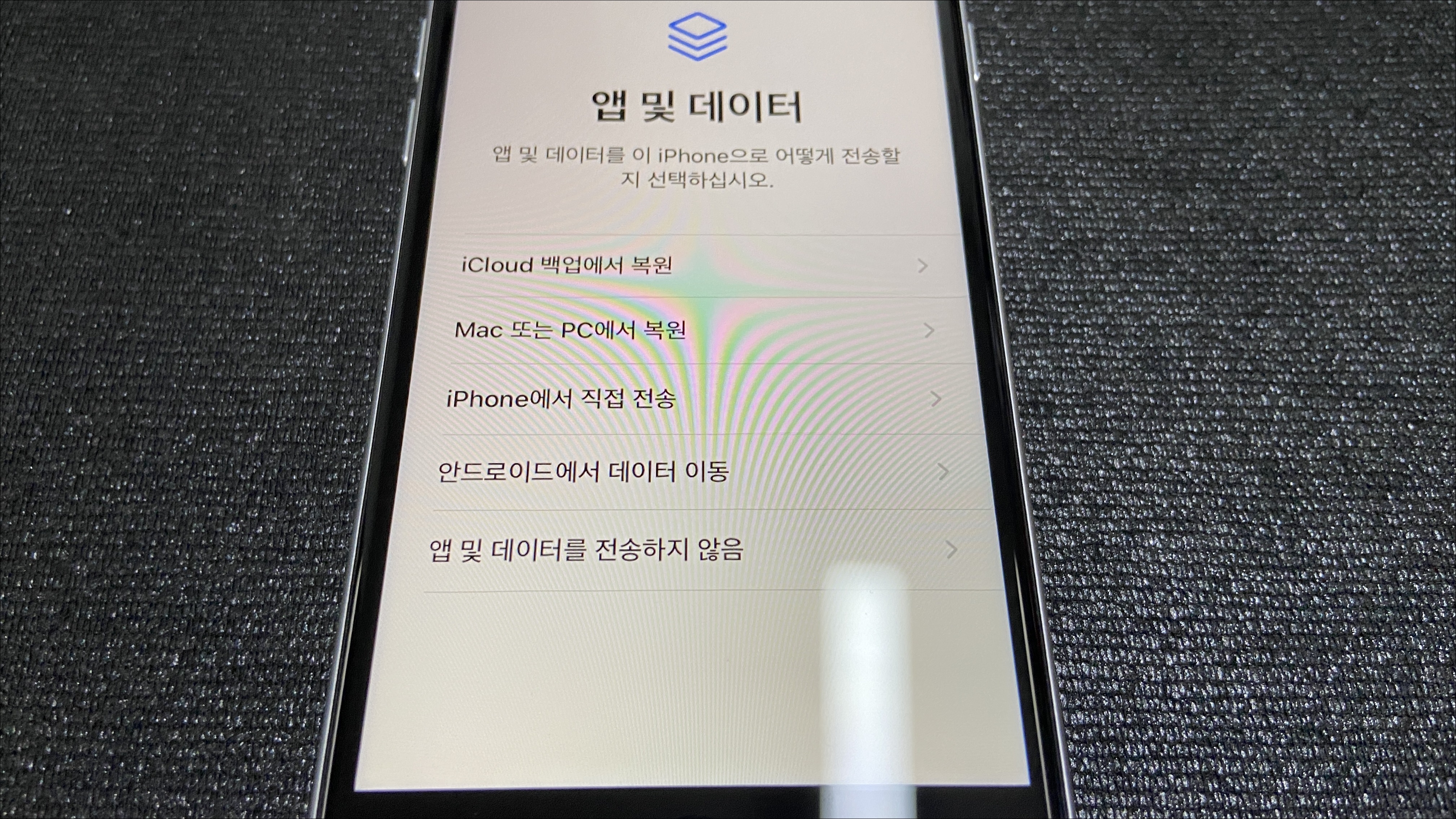 이제는 전원을 켜고 설정을 해줘야 합니다. 처음 사용하는 분들은 앱 및 데이터 전송을 하지 않음을 선택하면 됩니다. 그렇지 않고 기존에 사용하던 분들은 백업 데이터를 불러 올 수 있습니다. 아이폰에서 직접 전송을 하거나 PC에 받아 놓은 백업을 옮길 수 있습니다.