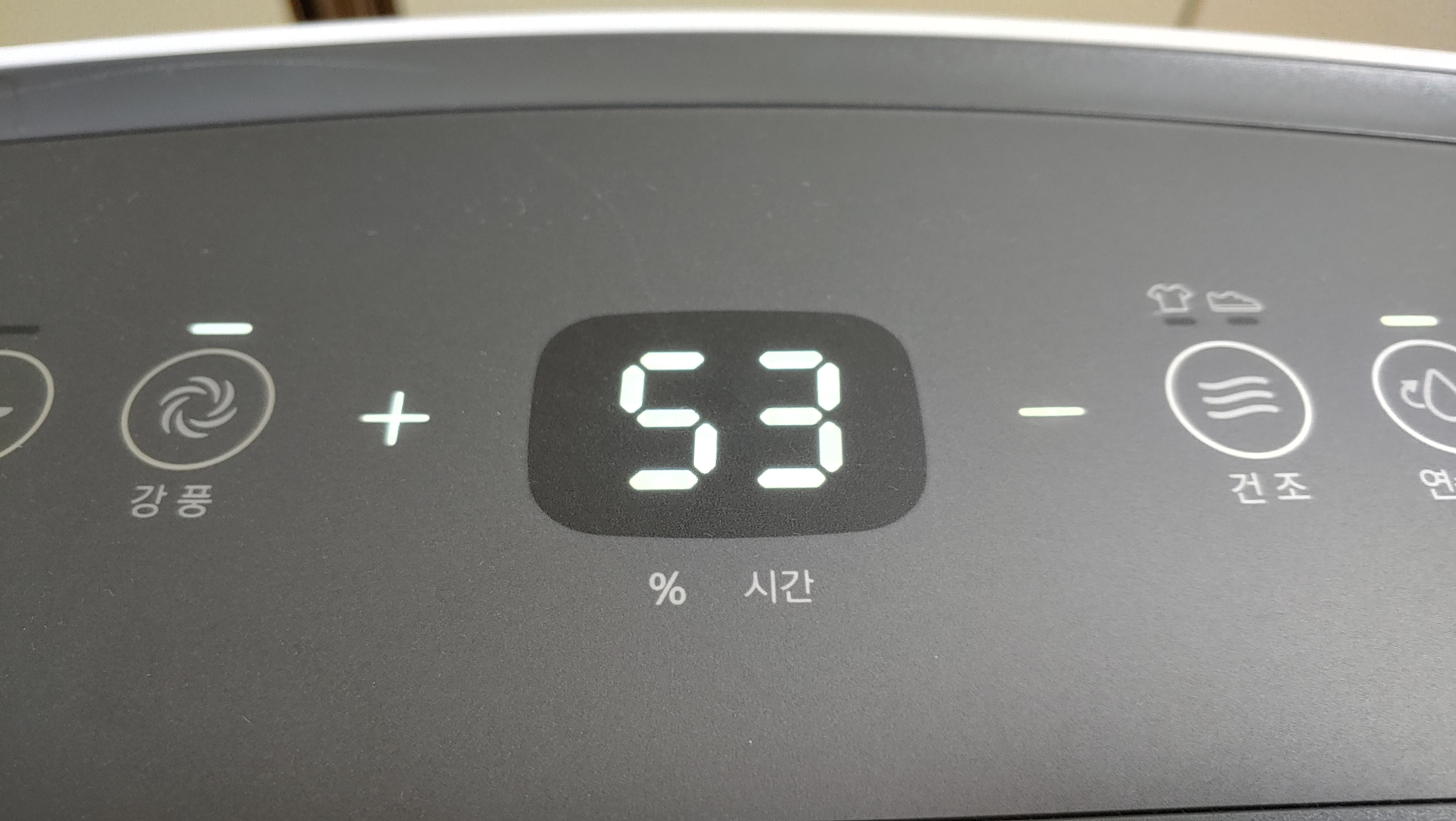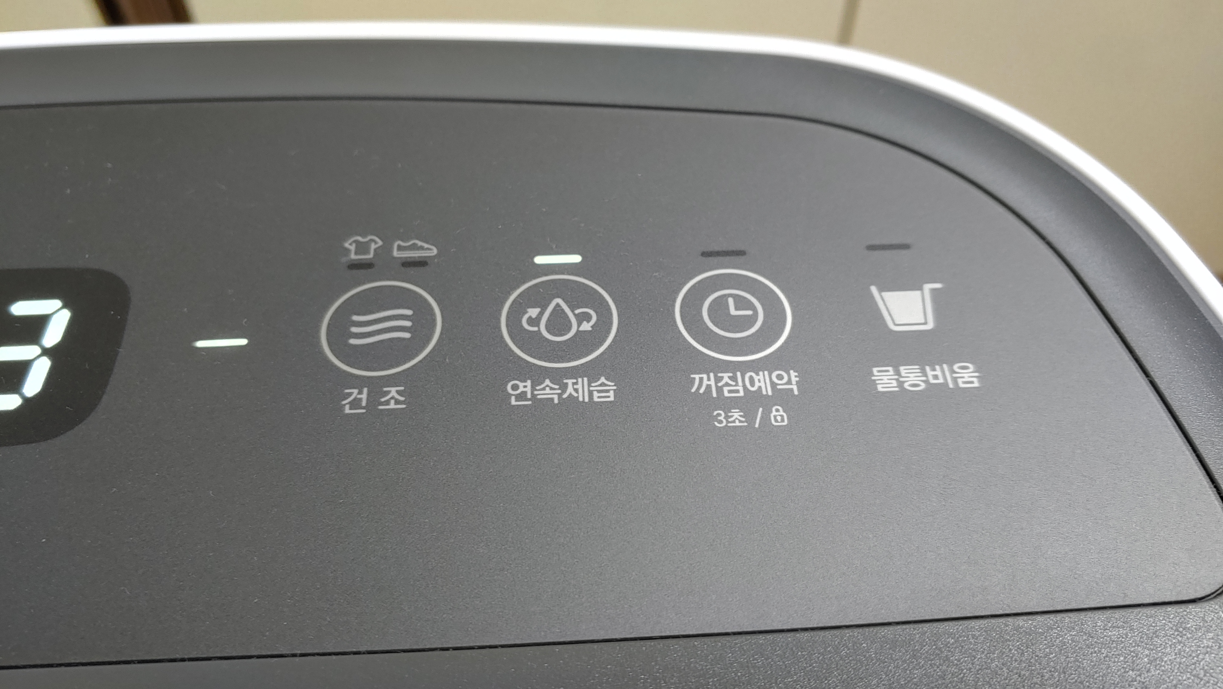 중앙에는 제습기가 작동하는 공간의 습도를 표시해 주는 디스플레이가 있습니다. 습도가 보통 60%가 넘어가면 불쾌함을 느끼게 되며, 50%정도만 되도 불쾌감이 없어집니다.